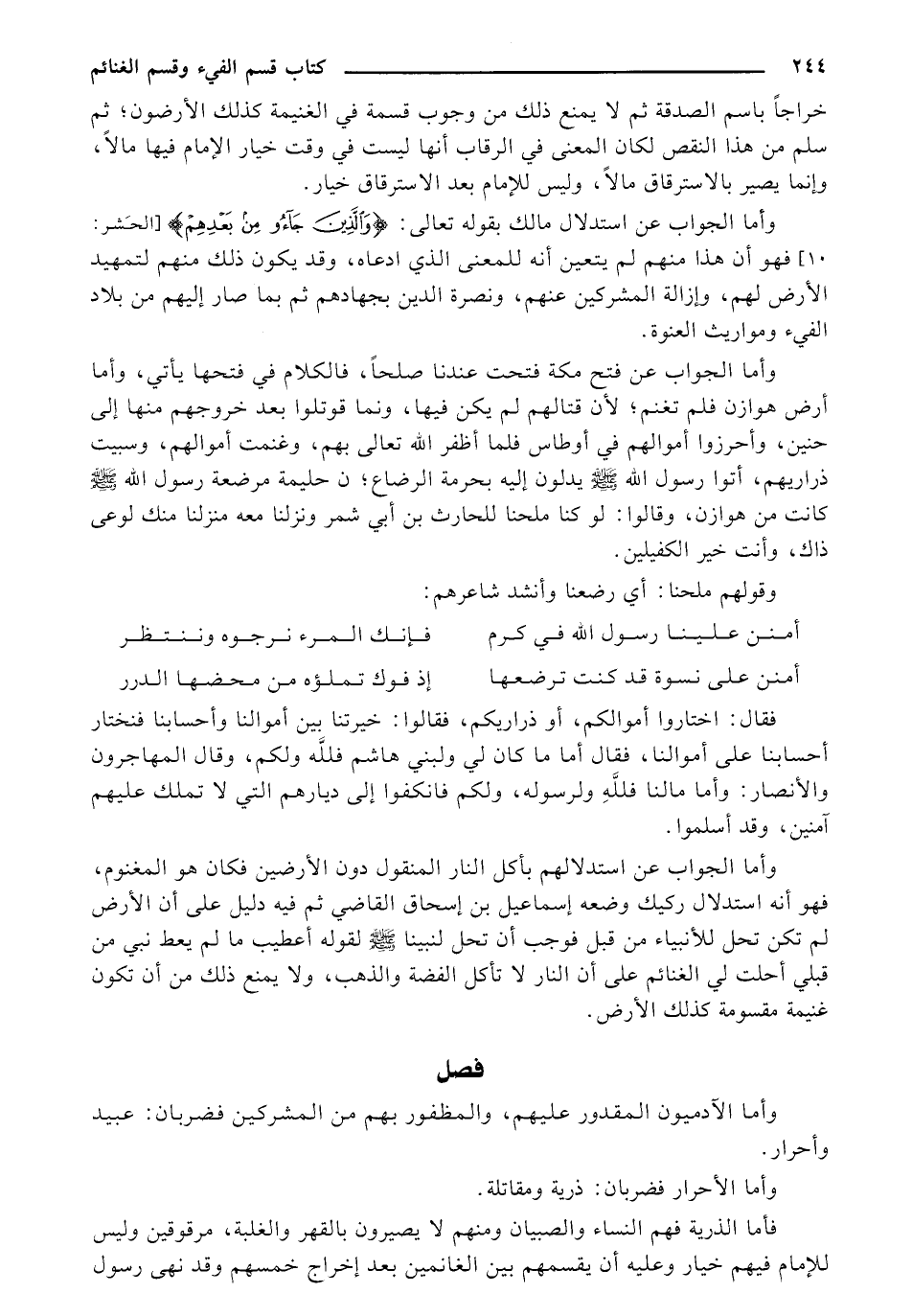 وأما الجواب عن فتح مكة فتحت عندنا صلحاً، فالكلام في فتحها يأتي، وأما أرض هوازن فلم تغنم؛ لأن قتالهم لم يكن فيها، ونما قوتلوا بعد خروجهم منها إلى حنين، وأحرزوا أموالهم في أوطاس فلما أظفر الله تعالى بهم، وغنمت أموالهم، وسبيت ذراريهم، أتوا رسول الله - صلى الله عليه وسلم - يدلون إليه بحرمة الرضاع؛ ن حليمة مرضعة رسول الله - صلى الله عليه وسلم - كانت من هوازن، وقالوا: لو كنا ملحنا للحارث بن أبي شمر ونزلنا معه منزلنا منك لوعى ذاك، وأنت خير الكفيلين