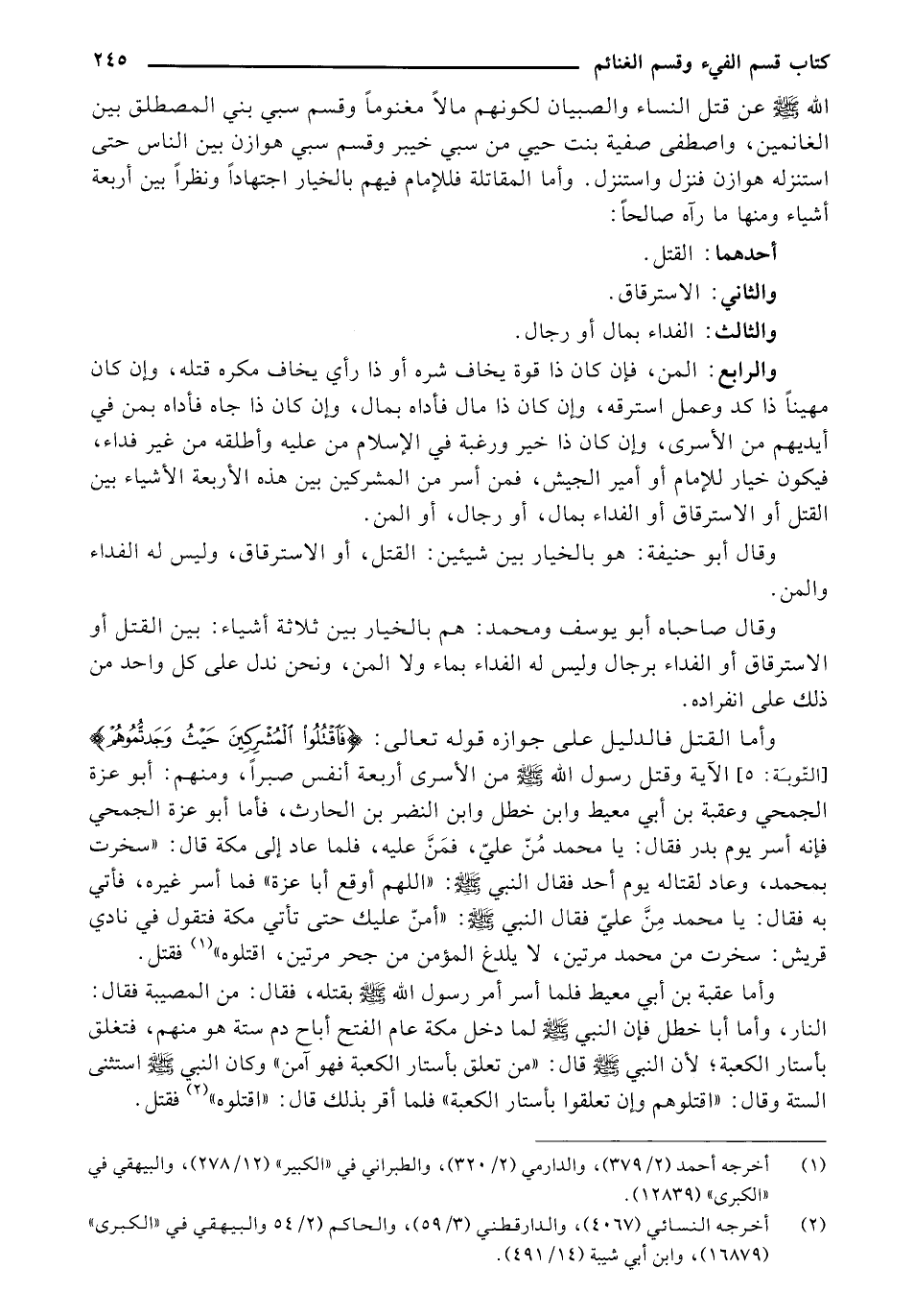 وأما القتل فالدليل على جوازه قوله تعالى: {فَاقْتُلُوا الْمُشْرِكِينَ حَيْثُ وَجَدْتُمُوهُمْ} [التوبة:5] الآية وقتل رسول الله - صلى الله عليه وسلم - من الأسرى أربعة أنفس صبراً، ومنهم: أبو عزة الجمحي وعقبة بن أبي معيط وابن خطل وابن النضر بن الحارث، فأما أبو عزة الجمحي فإنه أسر يوم بدر فقال: يا محمد من علي، فمن عليه، فلما عاد إلى مكة ط قال: "سخرت بمحمد، وعاد لقتاله يوم أحد فقال النبي - صلى الله عليه وسلم -: "اللهم أوقع أبا عزة" فما أسر غيره، فأتي به فقال: يا محمد من علي فقال النبي - صلى الله عليه وسلم -: "أمن عليك حتى تأتي مكة فتقول في نادي قريش: سخرت من محمد مرتين، لا يلدغ المؤمن من جحر مرتين، اقتلوه" (¬1) فقتل.