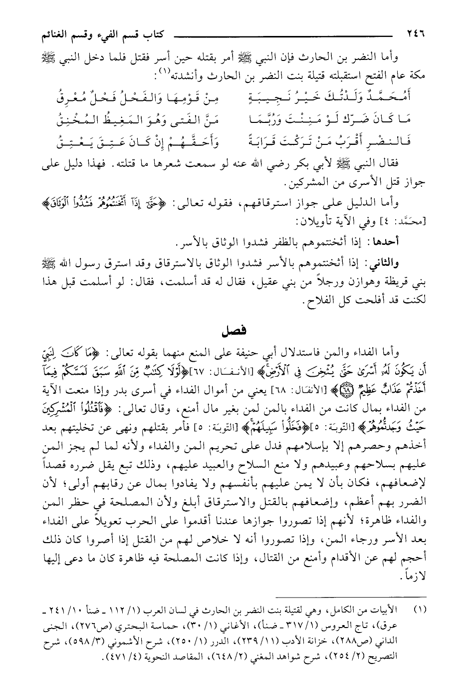 وأما النضر بن الحارث فإن النبي - صلى الله عليه وسلم - أمر بقتله حين أسر فقتل فلما دخل النبي - صلى الله عليه وسلم - مكة عام الفتح استقبلته قتيلة بنت النضر بن الحارث وأنشدته (¬1):