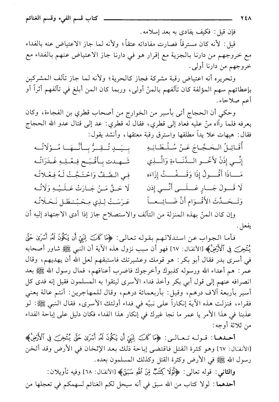 فأما الجواب عن استدلالهم بقوله تعالى: {مَا كَانَ لِنَبِيٍّ أَنْ يَكُونَ لَهُ أَسْرَى حَتَّى يُثْخِنَ فِي الأَرْضِ} [الأنفال: 67] فهو أن سبب نزول هذه الآية أن النبي - صلى الله عليه وسلم - شاور أصحابه في أسرى بدر فقال أبو بكر: هو قومك وعشيرتك فاستبقهم لعل الله أن يهديهم، وقال عمر: هم أعداء الله ورسوله كذبوك وأخرجوك فاضرب أعناقهم، فمال رسول الله - صلى الله عليه وسلم - بعد انصرافه عنهم إلى قول أبي بكر وأخذ فداء الأسرى ليتقوا به المسلمون فقيل إنه فدى كل بأربعة آلاف درهم، وقيل: أربعمائة درهم، وقال للمهاجرين: أنتم عالة يعني فقراء، فنزلت هذه الآية إنكارًا على نبيّه في فداء أولئك الأسرى، فقال النبي - صلى الله عليه وسلم -: لو عذبنا في هذا الأمر يا عمر ما نجا غيرك في إنكار هذا الفداء فكان دليل على إباحة الفداء من ثلاثة أوجه: