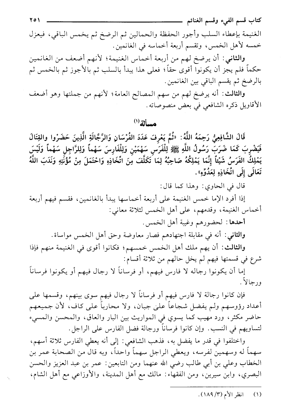 قال الشافعي رحمه الله: " ثم يعرف عدد الفرسان والرجالة الذين حضروا والقتال فيضرب كما ضرب رسول الله - صلى الله عليه وسلم - للفرس سهمين وللفارس سهماً وللراجل سهماً وليس يملك الفرس شيئاً إنما يملكه صاحبه لما تكلف من اتخاذه واحتمل من مؤنته وندب الله تعالى إلى اتخاذه لعدوه ".