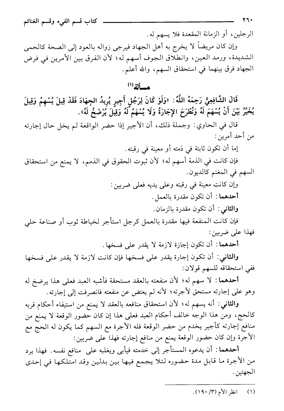 قال الشافعي رحمه الله: "ولو كان لرجل أجير يريد الجهاد فقد قيل يسهم وقيل يخير بين أن يسهم لأ وتطرح الإجارة ولا يسهم له وقيل يرضخ له".