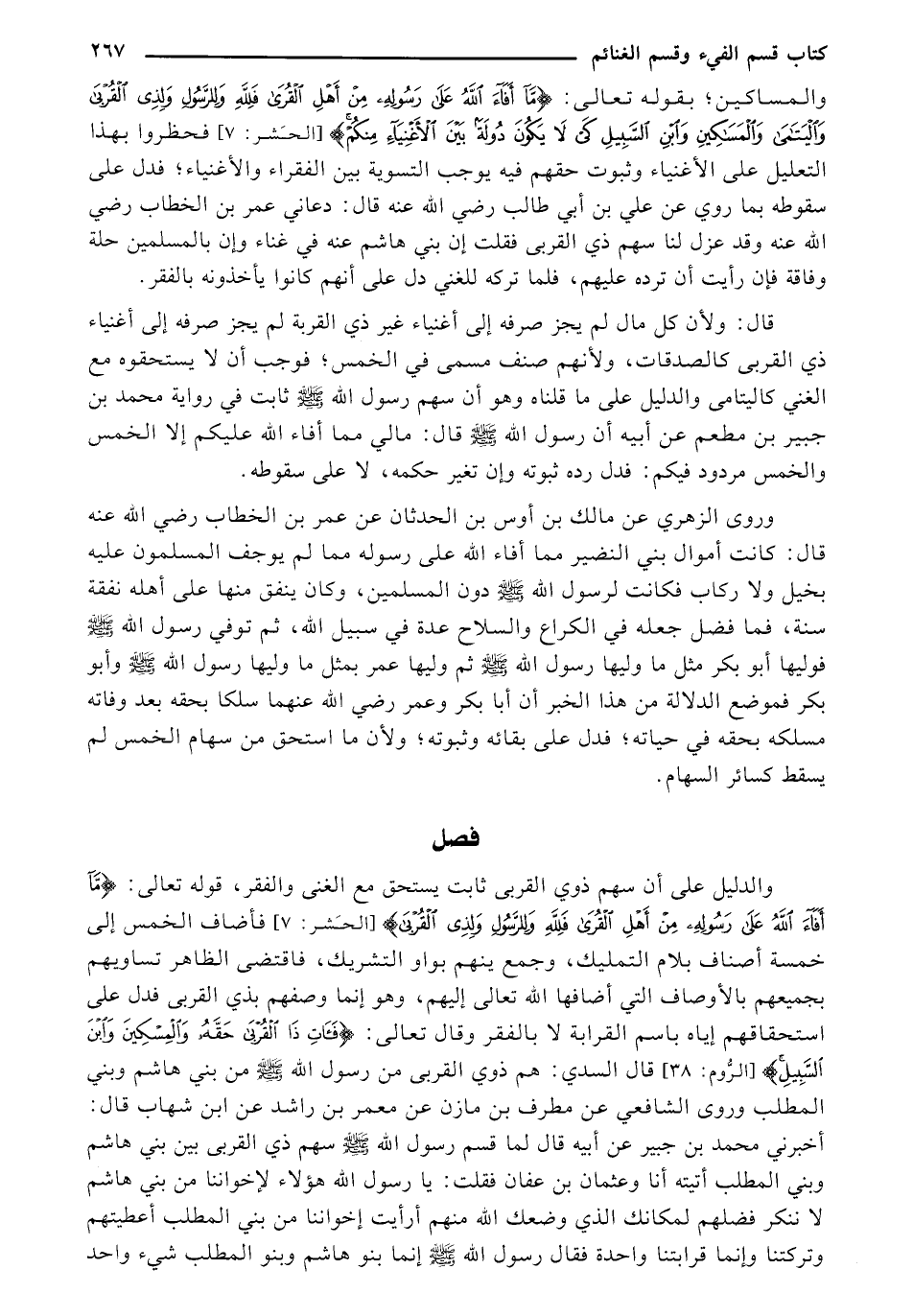 والمساكين؛ بقوله تعالى: {مَا أَفَاءَ اللَّهُ عَلَى رَسُولِهِ مِنْ أَهْلِ الْقُرَى فَلِلَّهِ وَلِلرَّسُولِ وَلِذِي الْقُرْبَى وَالْيَتَامَى وَالْمَسَاكِينِ وَابْنِ السَّبِيلِ كَيْ لا يَكُونَ دُولَةً بَيْنَ الأَغْنِيَاءِ مِنْكُمْ} [الحشر: 7] فحظروا بهذا التعليل على الأغنياء وثبوت حقهم فيه يوجب التسوية بين الفقراء والأغنياء؛ فدل على سقوطه بما روي عن علي بن أبي طالب رضي الله عنه قال: دعاني عمر بن الخطاب رضي الله عنه وقد عزل لنا سهم ذي القربى فقلت إن بني هاشم عنه في غناء وان بالمسلمين حلة وفاقة فإن رأيت أن ترده عليهم، فلما تركه للغني دل على أنهم كانوا يأخذونه بالفقر.