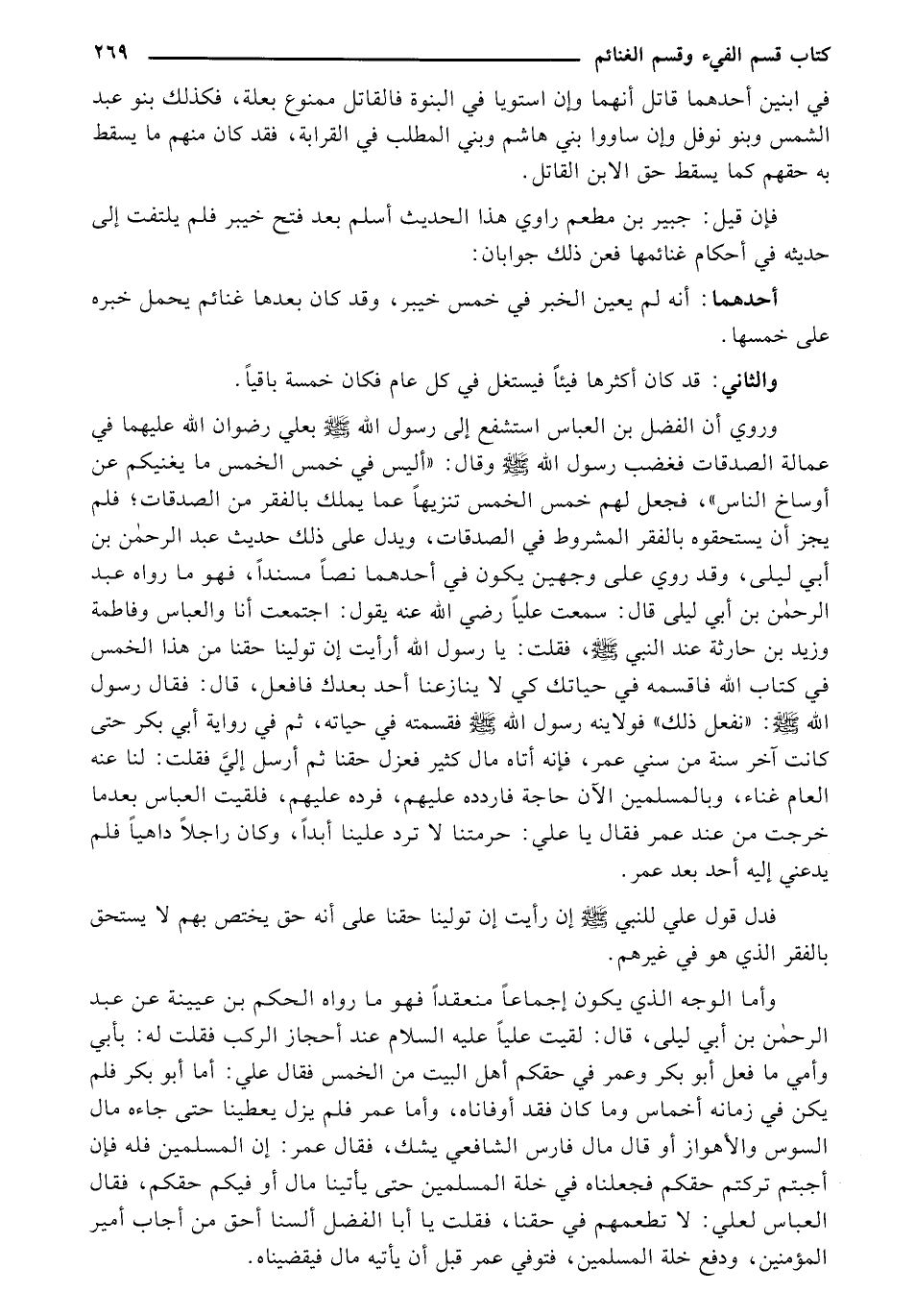 وأما الوجه الذي يكون إجماعاً منعقداً فهو ما رواه الحكم بن عيينة عن عبد الرحمن بن أبي ليلى، قال: لقيت علياً عليه السلام عند أحجاز الركب فقلت له: بأبي وأمي ما فعل أبو بكر وعمر في حقكم أهل البيت من الخمس فقال علي: أما أبو بكر فلم يكن في زمانه أخماس وما كان فقد أوفاناه، وأما عمر فلم يزل يعطينا حتى جاءه مال السوس والأهواز أو قال مال فارس الشافعي يشك، فقال عمر: إن المسلمين فله فإن أجبتم تركتم حقكم فجعلناه في خلة المسلمين حتى يأتينا مال أو فيكم حقكم، فقال العباس لعلي: لا تطعمهم في حقنا، فقلت يا أبا الفضل ألسنا أحق من أجاب أمير المؤمنين، ودفع خلة المسلمين، فتوفي عمر قبل أن يأتيه مال فيقضيناه.