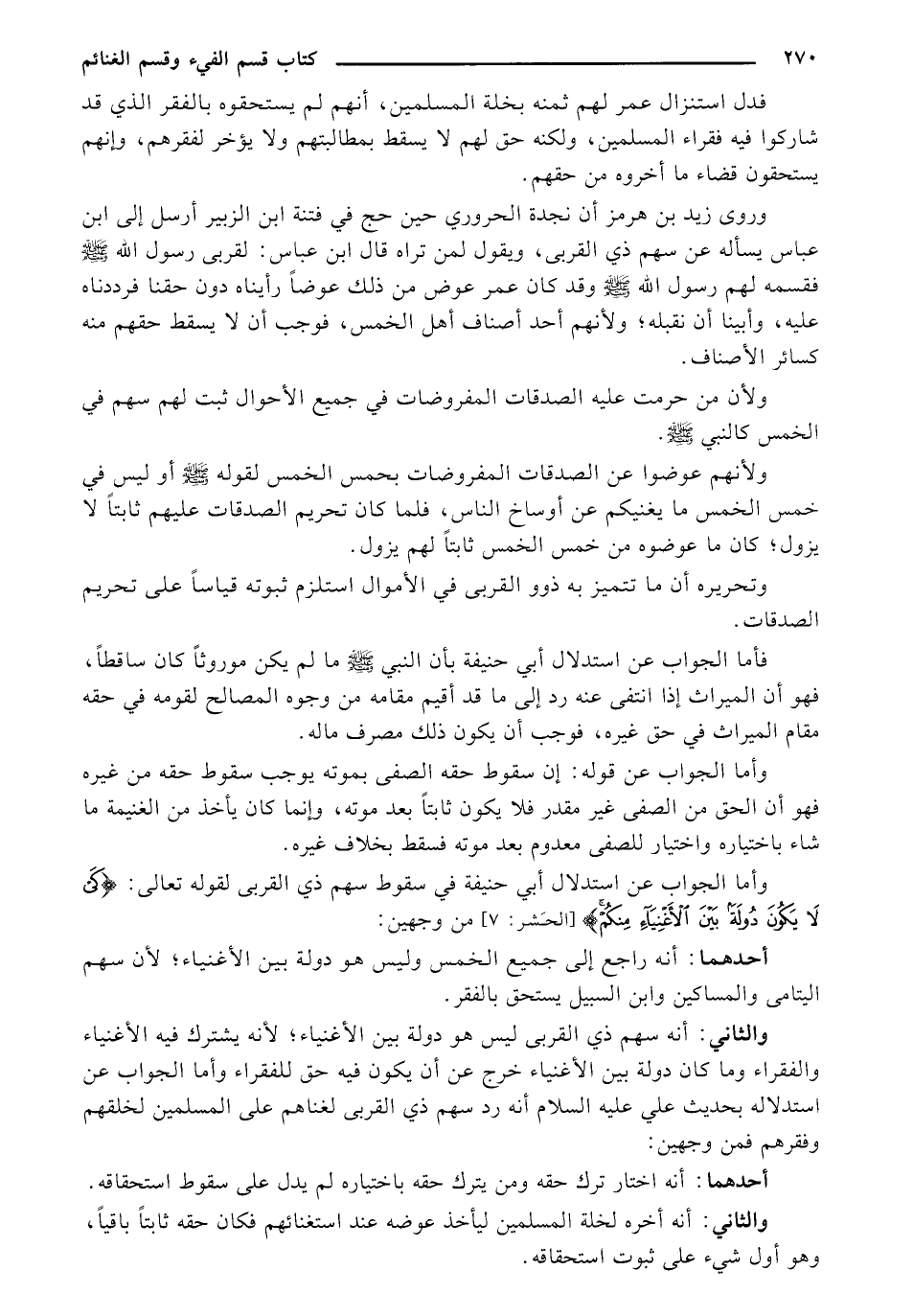 والثاني: أنه سهم ذي القربى ليس هو دولة بين الأغنياء؛ لأنه يشترك فيه الأغنياء والفقراء وما كان دولة بين الأغنياء خرج عن أن يكون فيه حق للفقراء وأما الجواب عن استدلاله بحديث علي عليه السلام أنه رد سهم ذي القربى لغناهم على المسلمين لخلقهم وفقرهم فمن وجهين: