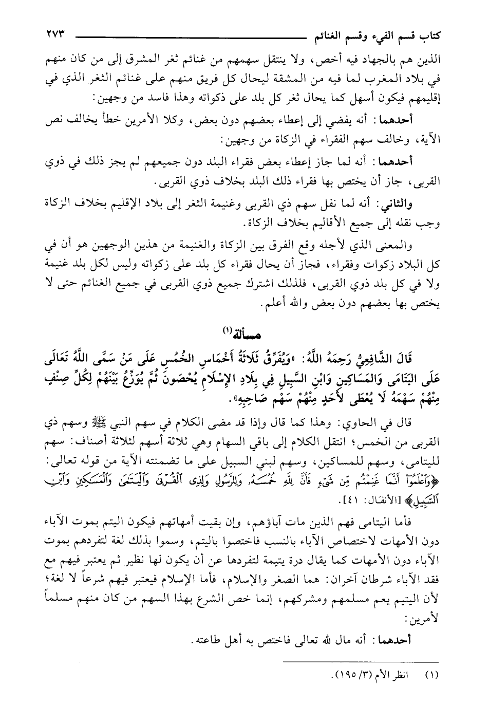قال الشافعي رحمه الله: "ويفرق ثلاثة أخماس الخمس على من سمى الله تعالى على اليتامى والمساكين وابن السبيل في بلاد الإسلام يحصون ثم يوزع بينهم لكل صنف منهم سهمه لا يعطى لأحدٍ منهم سهم صاحبه".