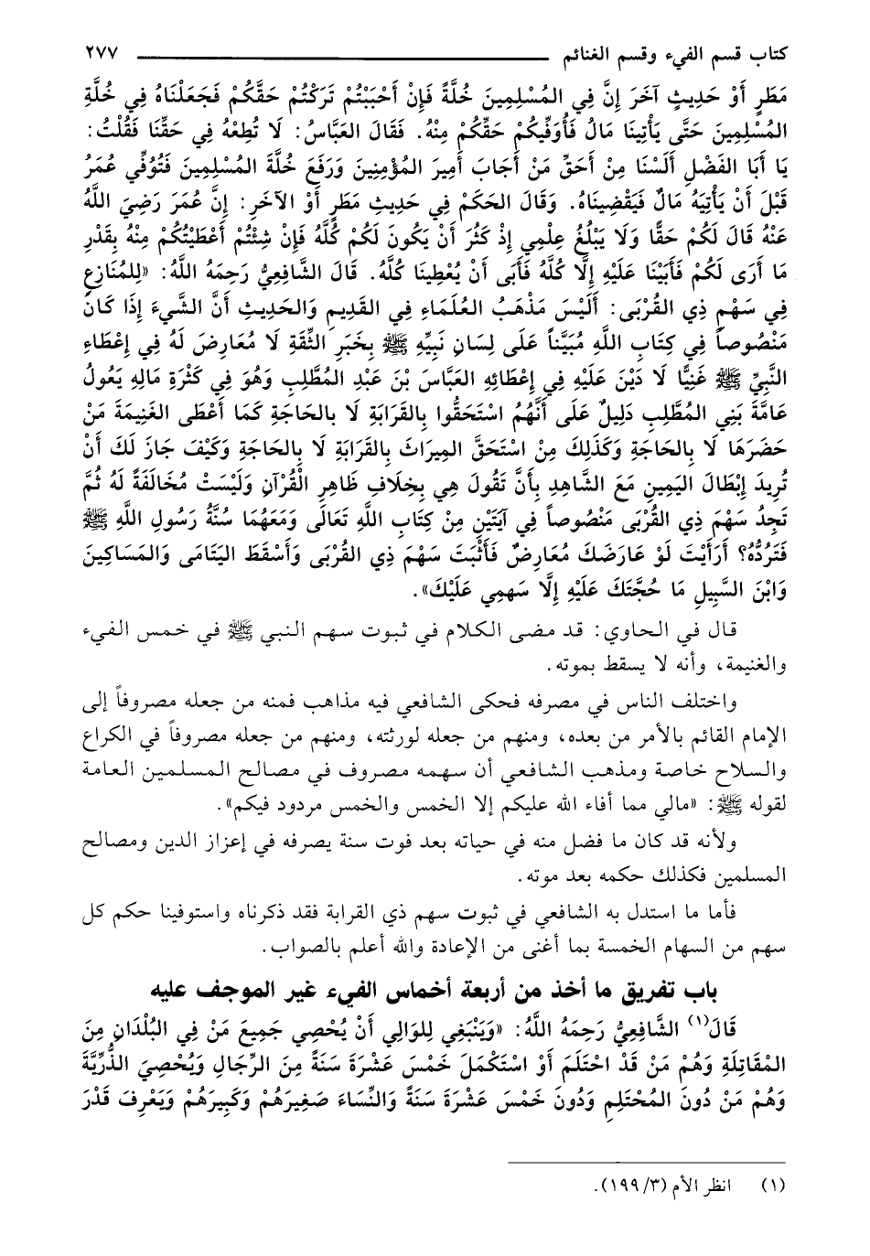 مطرٍ أو حديثٍ آخر إن في المسلمين خلة فإن أحببتم تركتم حقكم فجعلناه في خلة المسلمين حتى يأتينا مال فأوفيكم حقكم منه. فقال العباس: لا تطعه في حقنا فقلت: يا أبا الفضل ألسنا من أحق من أجاب أمير المؤمنين ورفع خلة المسلمين فتوفي عمر قبل أن يأته مال فيقضيناه. وقال الحكم في حديث مطر أو الآخر: إن عمر رضي الله عنه قال لكم حقا ولا يبلغ علمي إذ كثر أن يكون لكم كله فإن شئتم أعطيتكم منه بقدر ما أرى لكم فأبينا عليه إلا كله فأبى أن يعطينا كله. قال الشافعي رحمه الله: "للمنازع في سهم ذي القربى: أليس مذهب العلماء في القديم والحديث أن الشيء إذا كان منصوصاً في كتاب الله مبينا على لسان نبيه - صلى الله عليه وسلم - بخبر الثقة لا معارض له في إعطاء النبي - صلى الله عليه وسلم - غنياً لا دين عليه في إعطائه العباس بن عبد المطلب وهو في كثرة ماله يعول عامة بني المطلب دليل على أنهم استحقوا بالقرابة لا بالحاجة كما أعطى الغنيمة من حضرها لا بالحاجة وكذلك من استحق الميراث بالقرابة لا بالحاجة وكيف جاز لك أن تريد إبطال اليمين مع الشاهد بأن تقول هي بخلاف ظاهر القرآن وليست مخالفة له ثم تجد سهم ذي القربى منصوصاً في آيتين من كتاب الله تعالى ومعهما سنة رسول الله - صلى الله عليه وسلم - فترد؟ أرأيت لو عارضك معارض فأثبت سهم ذي القربى وأسقط اليتامى والمساكين وابن السبيل ما حجتك عليه إلا سهمي عليك".