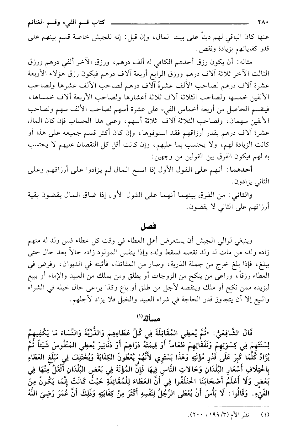 قال الشافعي: "ثم يعطي المقاتلة في كل عطاءهم والذرية والنساء ما يكفيهم لسنتهم في كسوتهم ونفقاتهم طعاماً أو قيمته دراهم أو دنانير تعطى المنفوس شيئاً ثم يزداد كلما كبر على قدر مؤنته وهذا يستوي لأنهم يعطون الكفاية ويختلف في مبلغ العطاء باختلاف أسعار البلدان وحالات الناس فيها فإن المؤنة في بعض البلدان أثقل منها في بعض ولا أعلم أصحابنا اختلفوا في أن العطاء للمقاتلة حيث كانت إنما مكون من الفيء. وقالوا: لا بأس أن يعطى الرجل لنفسه أكثر من كفايته وذلك أن عمر رضي الله