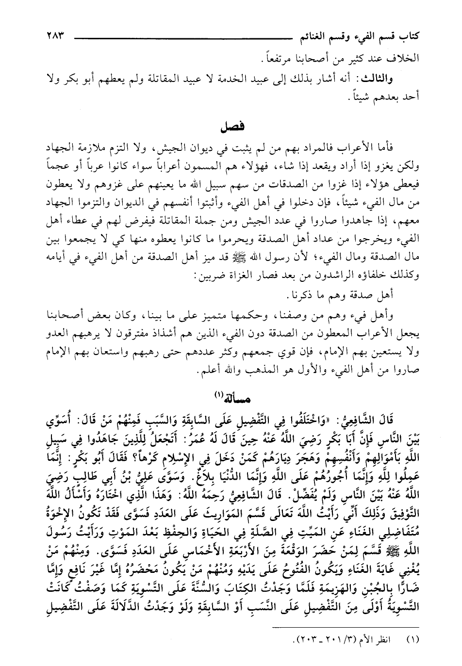 قال الشافعي: "واختلفوا في التفضيل على السابقة والسبب فمنهم من قال: أسوي بين الناس فإن أبا بكر رضي الله عنه حين قال له عمر: أتجعل للذين جاهدوا في سبيل الله بأموالهم وأنفسهم وهجر ديارهم كمن دخل في الإسلام كرهاً؛ فقال أبو بكر: إنما عملوا لله وإنما أجورهم على الله وإنما الدنيا بلاغ. وسوى علي بن أبي طالب رضي الله عنه بين الناس ولم يفضل. قال الشافعي رحمه الله: وهذا الذي اختاره وأسأل الله التوفيق وذلك أني رأيت الله تعالى قسم المواريث على العدد فسوى فقد تكون الإخوة متفاضلي الغناء عن الميت في الصلة في الحياة والحفظ بعد الموت ورأيت رسول الله - صلى الله عليه وسلم - قسم لمن حضر الوقعة من الأربعة الأخماس على العدد فسوى. ومنهم من يفني غاية الغناء ويكون الفتوح على يديه ومنهم من يكون محضره إما غير نافع وإما ضارا بالجبن والهزيمة فلما وجدث الكتاب والسنة على التسوية كما وصفت كانت التسوية أولى من التفضيل على النسب أو السابقة ولو وجدت الدلالة على التفضيل