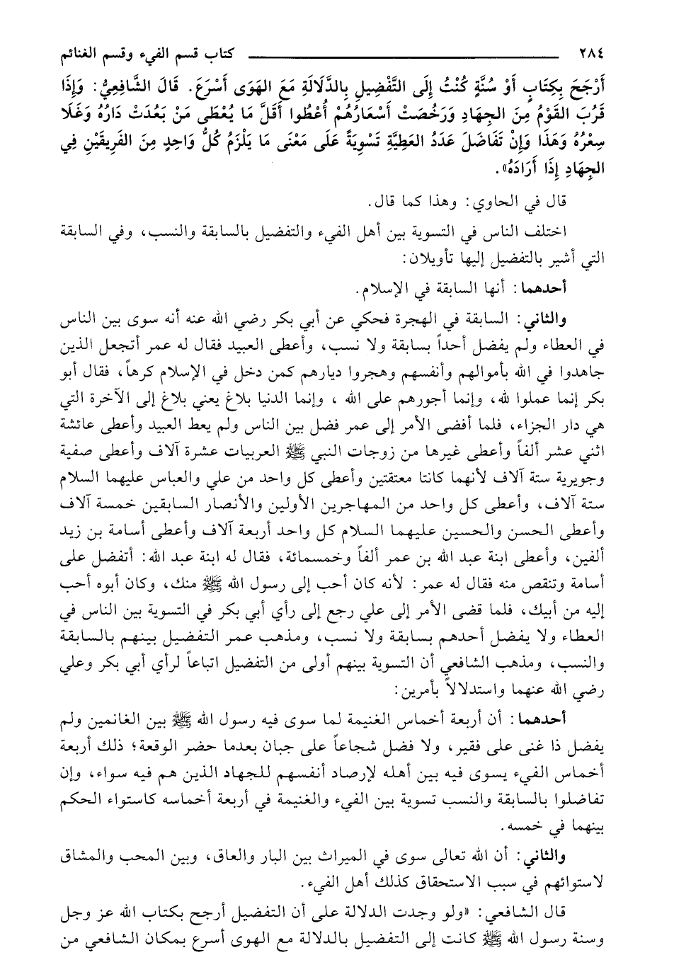 والثاني: السابقة في الهجرة فحكي عن أبي بكر رضي الله عنه أنه سوى بين الناس في العطاء ولم يفضل أحداً بسابقة ولا نسب، وأعطى العبيد فقال له عمر أتجعل الذين جاهدوا في الله بأموالهم وأنفسهم وهجروا ديارهم كمن دخل في الإسلام كرهاً، فقال أبو بكر إنما عملوا لله، وإنما أجورهم على الله، وإنما الدنيا بلاغ يعني بلاغ إلى الآخرة التي هي دار الجزاء، فلما أفضى الأمر إلى عمر فضل بين الناس ولم يعط العبيد وأعطى عائشة اثني عشر ألفاً وأعطى غيرها من زوجات النبي - صلى الله عليه وسلم - العربيات عشرة آلاف وأعطى صفية وجويرية ستة آلاف لأنهما كانتا معتقتين وأعطى كل واحد من علي والعباس عليهما السلام ستة آلاف، وأعطى كل واحد من المهاجرين الأولين والأنصار السابقين خمسة آلاف وأعطى الحسن والحسين عليهما السلام كل واحد أربعة آلاف وأعطى أسامة بن زيا ألفين، وأعطى ابنة عبد الله بن عمر ألفاً وخمسمائة، فقال له ابنة عبد الله: أتفضل على أسامة وتنقص منه فقال له عمر: لأنه كان أحب إلى رسول الله - صلى الله عليه وسلم - منك، وكان أبوه أحب إليه من أبيك، فلما قضى الأمر إلى علي رجع إلى رأي أبي بكر في التسوية بين الناس في العطاء ولا يفضل أحدهم بسابقة ولا نسب، ومذهب عمر التفضيل بينهم بالسابقة والنسب، ومذهب الشافعي أن التسوية بينهم أولى من التفضيل إتباعاً لرأي أبي بكر وعلي رضي الله عنهما واستدلالاً بأمرين: