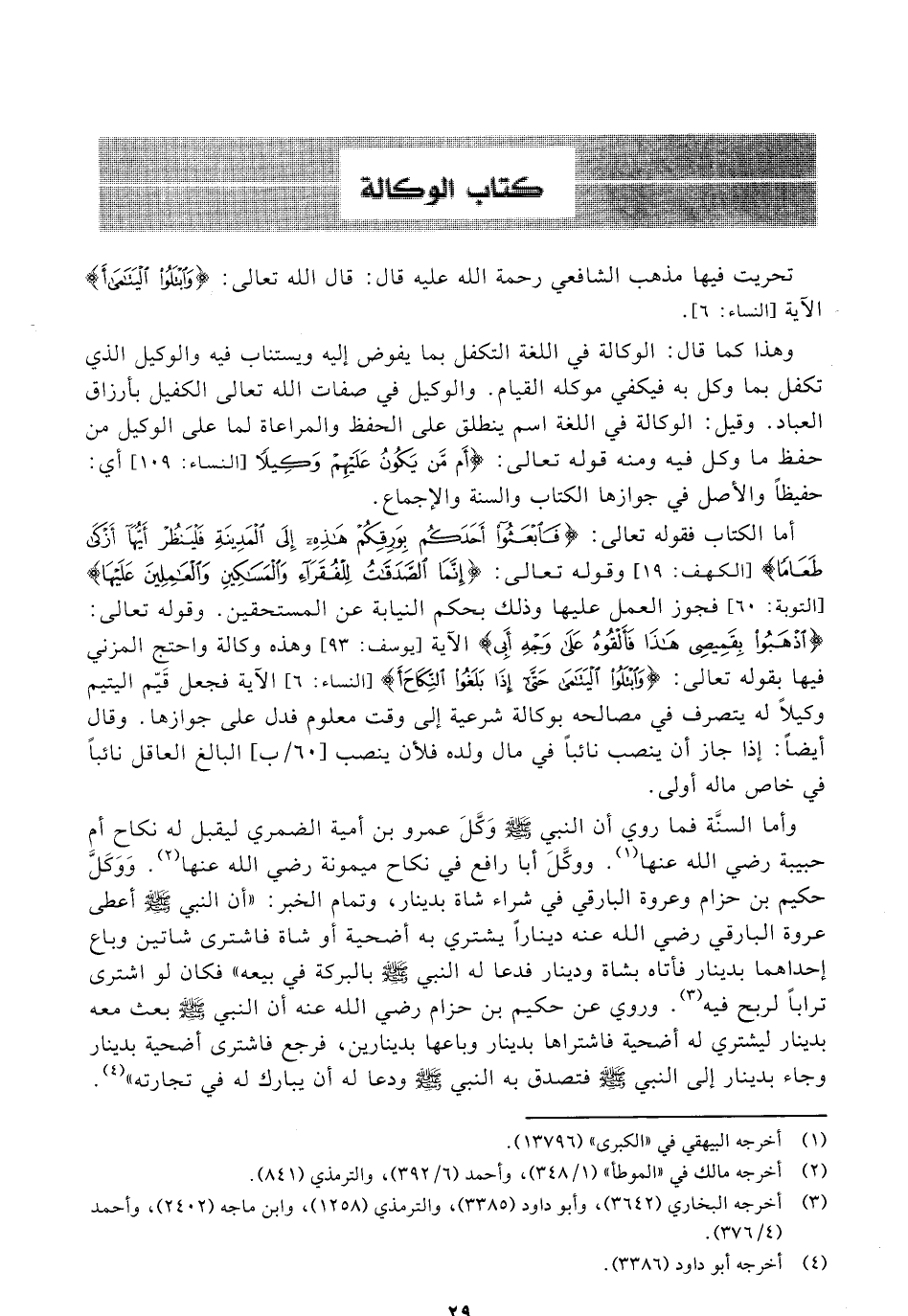 وأما السنة فما روي أن النبي - صلى الله عليه وسلم - وَكَّلَل عمرو بن أمية الضمري ليقبل له نكاح أم حبيبة رضي الله عنها (¬1). ووكَّلَ أبا رافع في نكاح ميمونة رضي الله عنها (¬2). وَوَكَلَّ حكيم بن حزام وعروة البارقي في شراء شاة بدينار، وتمام الخبر:"أن النبي - صلى الله عليه وسلم - أعطى عروة البارقي رضي الله عنه دينارًا يشتري به أضحية أو شاة فاشترى شاتين وباع إحداهما بدينار فأتاه بشاة ودينار فدعا له النبي - صلى الله عليه وسلم - بالبركة في بيعهه" فكان لو اشترى ترابًا لربح فيه (¬3). وروي عن حكيم بن حزام رضي الله محنه أن النبي - صلى الله عليه وسلم - بعث معه بدينار ليشتري له أضحية فاشتراها بدينار وباعها بدينارين فربع فاشترى أضحية بدينار وجاء بدينار إلى النبي - صلى الله عليه وسلم - فتصدق به النبي - صلى الله عليه وسلم - ودعا له أن يبارك له في تجارته" (¬4).