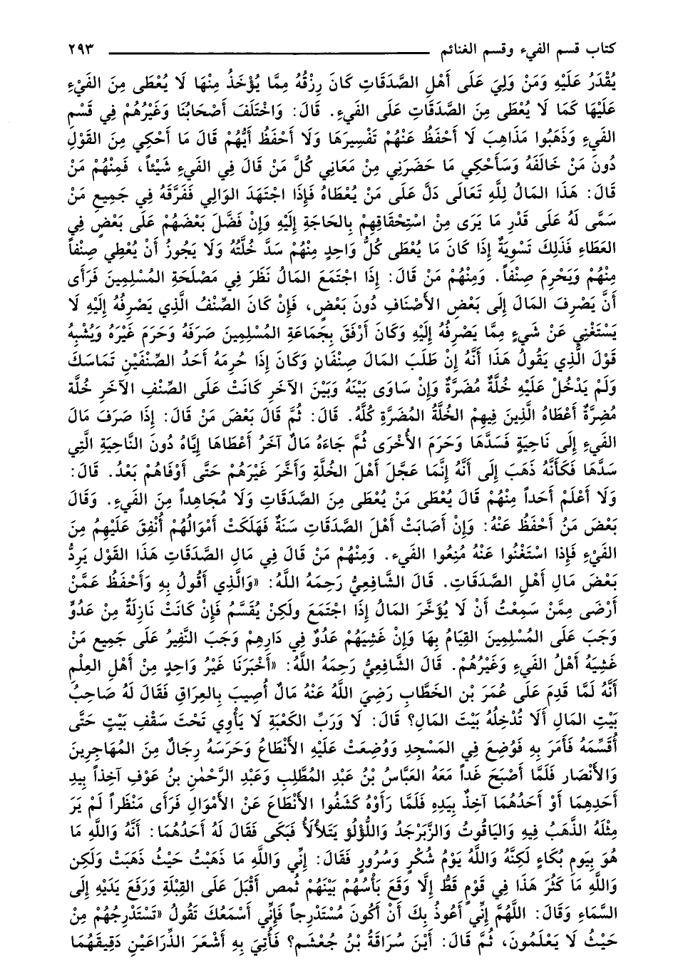 يقدر عليه ومن ولي على أهل الصدقات كان رزقه مما يؤخذ منها لا يعطى من الفيء عليها كما لا يعطى من الصدقات على الفيء. قال: واختلف أصحابنا وغيرهم في هشم الفيء وذهبوا مذاهب لا أحفظ عنهم تفسيرها ولا أحفظ أيهم مال ما أحكي من القول دون من خالفه وسأحكي ما حضرني من معاني كل من قال في الفيء شيئاً، فمنهم من هال: هذا المال لله تعالى دل على من يعطاه فماذا اجتهد الوالي ففرقه في جميع من سمى له على قدر ما يرى من استحقاقهم بالحاجة إليه وإن فضل بعضهم على بعض في العطاء فذلك تشويه إذا كان ما يعطى كل واحدٍ منهم سد خلته ولا يجوز أن يعطي صنفاً منهم ومحرم صنفاً. ومنهم من مال: إذا اجتمع المال نظر في مصلحه المسلمين فرأى أن يصرف المال إلى بعض الأصناف دون بعض، فمان كان الصنف الذي يصرفه إليه لا يستغنى عن شي، مما يصرفه إليه وكان أرفو بجماعة المسلمين صرفه وحرم غيره ويشبه قول الذي يقول هذا أنأ إن طلب المال صنفان وكان إذا حرمه أحد الصنفين تماسك ولم يدخل عليه خله مضره وان ساوى بينه وبين الأخر كانت على الصنف الأخر خله مضرة أعطاه الذين فيهم الخلة المضرة كلأ. قال: ثم مال بعض من مال: إذا صرف مال الفيء إلى ناحية فسدها وحرم الأخرى ثم جاءه مال آخر أعطاها إياه دون الناحية التي سدها فكأنه ذهب إلى أنأ إنما عجل أهل الخلة وأخر غيرهم حتى أوفاهم بعد. قال: ولا أعلم أحداً منهم مال يعطى من يعطى من الصدقات ولا مجاهداً من الفيء. وقال بحض من أحفظ عنه: وإن أصابت أهل الصدقات سنة فهلكت أموالهم أنفق عليهم من الفيء فإذا استغنوا عنه منعوا الفيء. ومنهم من قال في مال الصدقات هذا القول يرد بعض مال أهل الصدقات. قال الشافعي فعي رحمه الله: "والذي أقول به وأحفظ عمن أرضى ممن سمعت أن لا يؤخر المال إذا اجتمع ولكن يقم فإن كانت نازله من عدو وجب على المسلمين القيام بها وإن غشيهم عدو في دارهم وجب النفير على جميع من غشت أهل الفيء وغيرهم. مال الشافعي رحمه الله: "أخبرنا غير واحد من أهل العلم أنه لما قدم على عمر بن الخطاب رضي الله عنه مال أصيب بالعراق فقال له صاحب بيت المال ألا تدخله بيت المال؟ قال: لا ورب الكعبة لا يأوي تحت سقف بيتٍ حتى أقسمه فأمر به فوضع في المسجد ووضعت عليه الأنطاع وحرساً رجال من المهاجرين والأنصار فلما أصبح غداً معه العباس بن عبد المطلب وعبد الرحمن بن عوف أخذاً بيد أحدهما أو أحدهما أخذ بيده فلما رأوه كشفوا الأنطاع عن الأموال فرأى منظراً لم ير مثله الذهب فيه والياقوت والزبرجد واللؤلو يتلألأ فبكى فقال له أحدهما: أنه والله ما هو بيوم بكاء لكنه والله يوم شكر وسرور فقال: إني والله ما ذهبت حيث ذهبت ولكن والله ما كثر هذا في قوم قط إلا وقع بأسهم بينهم ثمص أقبل على القبلة ورفع يديه إلى السماء وقال: اللهم إني أعوذ بك أن أكون مستدرجاً فاني أسمعك تقول "تستدرجهم من حيث لا يعلمون، ثم قال: أين سراقة بن جعشم؟ فأتي به أشعر الذراعين دقيقهما