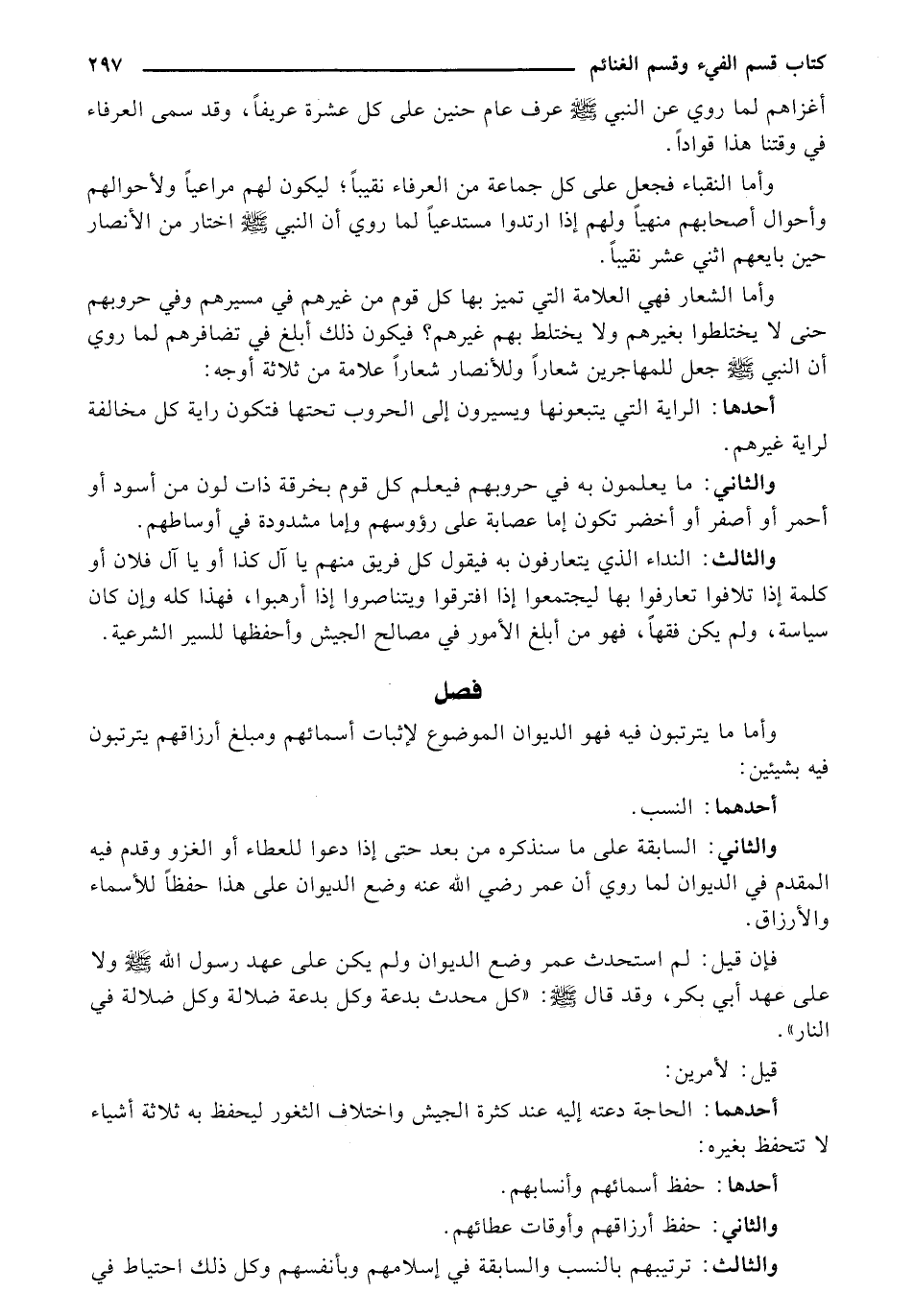 والثالث: النداء الذي يتعارفون به فيقول كل فريق منهم يا آل كذا أو يا آل فلان أو كلمة إذا تلافوا تعارفوا بها ليجتمعوا إذا افترقوا ويتناصروا إذا أرهبوا، فهذا كله وان كان سياسة، ولم يكن فقهاً، فهو من أبلغ الأمور في مصالح الجيش وأحفظها للسير الشرعية.