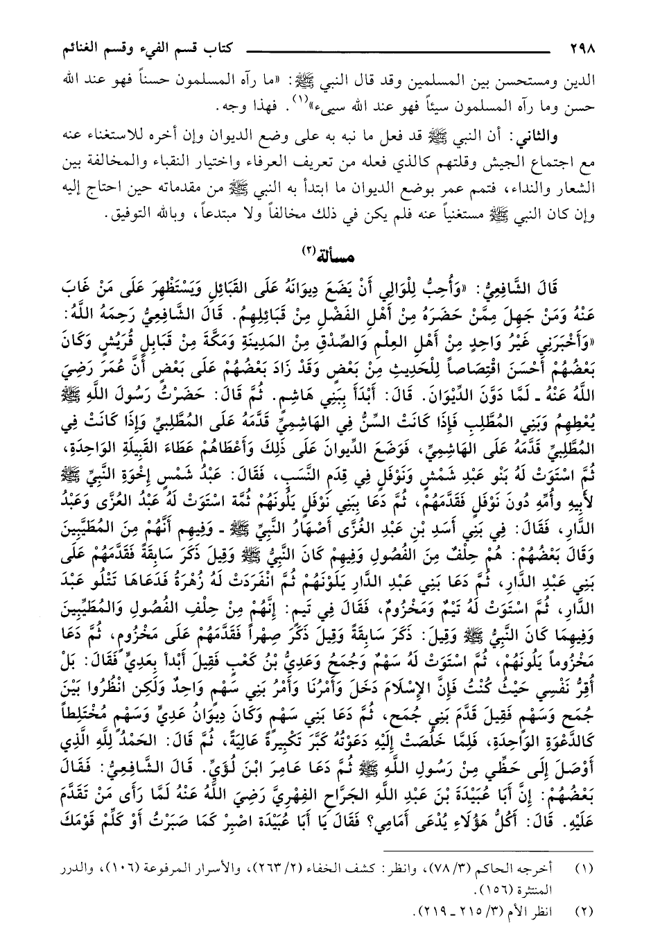قال الشافعي: "وأحب للوالي أن يضع ديواناً على القبائل ويستظهر على من غاب عنه ومن جهل ممن حضره من أهل الفضل من قبائلهم. قال الشافعي رحمه الله: "وأخبرني غير واحد من أهل العلم والصدق من المدينة ومكة من قبابل قريش وكان بعضهم أحسن امتصاصاً للحديث من بعض وقد زاد بعضهم على بعض أن عمر رضي الله عنه - لما دون الديوان. قال: أبدأ ببني هاشم. ثم قال: حضرت رسول الله - صلى الله عليه وسلم - يعطهم وبني المطلب فإذا كانت السن في الهاشمي قدمه على المطلبي وإذا كانت في المطلبي قدمه على الهاشمي، فوضع الديوان على ذلك وأعطاهم عطاء القبيلة الواحدة، ثم استوت له بنو عبد شمس ونوفل في قدم النسب، فقال: عبد شمس إخوة النبي - صلى الله عليه وسلم - لأبيه وأمه دون نوفل فقدمهم، ثم دعا ببني نوفل يلونهم ثمة استوت له عبد العزى وعبد الدار، فقال: في بني أسد بن عبد العزى أصهار النبي - صلى الله عليه وسلم - وفيهم أنهم من المطيبين وقال بعضهم: هم حلف من الفصول وفيهم كان النبي - صلى الله عليه وسلم - وقيل ذكر سابقة فقدمهم على بني عبد الدار، ثم دعا بني عبد الدار يلونهم ثم انفردت له زهرة فدعاها تتلو عبد الدار، ثم استوت له تيم ومخزوم، فقال في تيم: إنهم من حلف الفصول والمطيبين وفيهما كان النبي - صلى الله عليه وسلم - وقيل: ذكر سابقة وقيل ذكر صهراً فقدمهم على مخزوم، ثم دعا مخزوماً يلونهم، ثم استوت له سهم وجمح وعدي بن كعب فقيل أبدأ بعدي فقال: بل أقر نفسي حيث كنت فإن الإسلام دخل وأمرنا وأمر بني سهم واحد ولكن انظروا بين جمح وسهم فقيل قدم بني جمح، ثم دعا بني سهم وكان ديوان عدي وسهم مختلطا كالدعوة الواحدة، فلما خلصت إليه دعوته كبر تكبيره عاليه، ثم قال: الحمد لله الذي أوصل إلى حظي من رسول الله - صلى الله عليه وسلم - ثم دعا عامر ابن لؤي. قال الشافعي: فقال بعضهم: إن أبا عبيدة بن عبا الله الجراح الفهري رضي الله عنه لما رأى من تقدم عليه. قال: أكل هؤلاء يدعى أمامي؟ فمال يا أبا عبيدة اصبر كما صبرت أو كلم قومك
