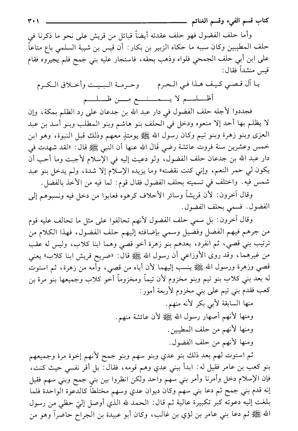 وأما حلف الفضول فهو حلف عقدته أيضا قبائل من قريش على نحو ما ذكرنا في حلف المطيبين وكان سببه ما حكاه الزبير بن بكار: أن قيس بن شيبة السلمي باع متاعاً على ابن أبي حلف الجمحي فلواه وذهب بحقه، فاستجار عليه بني جمح فلم يجيروه فقام قيس منشداً فقال: