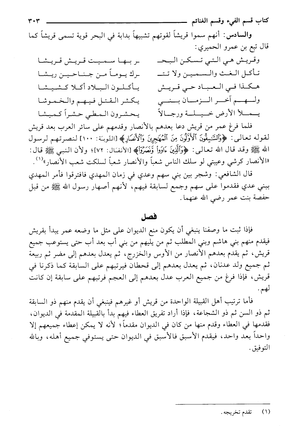 فإذا ثبت ما وصفنا ينبغي أن يكون منع الديوان على مثل ما وضعه عمر يبدأ بقريش فيقام منهم بني هاشم وبني المطلب ثم من يليهم من بني أب بعد أب حتى يستوعب جمع قريش، ثم يقدم بعدهم الأنصار من الأوس والخزرج، ثم يعدل بعدهم إلى مضر ثم ربيعة ثم جميع ولد عدنان، ثم يعدل بعدهم إلى قحطان فيرتبهم على السابقة كما ذكرنا في قريش، فإذا فرغ من جميع العرب عدل بعدهم إلى العجم فرتبهم على سابقة إن كانت لهم.