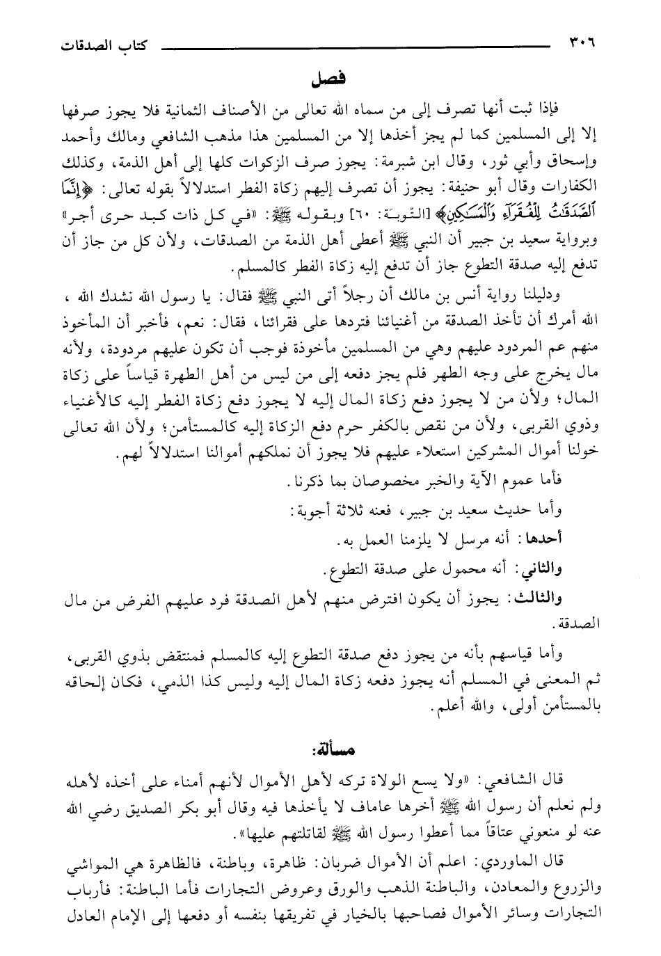 فإذا ثبت أنها تصرف إلى من سماه الله تعالى من الأصناف الثمانية فلا يجوز صرفها إلا إلى المسلمين كما لم يجز أخذها إلا من المسلمين هذا مذهب الشافعي ومالك وأحمد وإسحاق وأبي ثور، وقال ابن شبرمة: يجوز صرف الزكوات كلها إلى أهل الذمة، وكذلك الكفارات وقال أبو حنيفة: يجوز أن تصرف إليهم زكاة الفطر استدلالاً بقوله تعالى: {إِنَّمَا الصَّدَقَاتُ لِلْفُقَرَاءِ وَالْمَسَاكِينِ} [التوبة:60] وبقوله - صلى الله عليه وسلم -: "في كل ذات كبد حرى أجر" وبرواية سعيد بن جبير أن النبي - صلى الله عليه وسلم - أعطى أهل الذمة من الصدقات، ولأن كل من جاز أن تدفع إليه صدقة التطوع جاز أن تدفع إليه زكاة الفطر كالمسلم.
