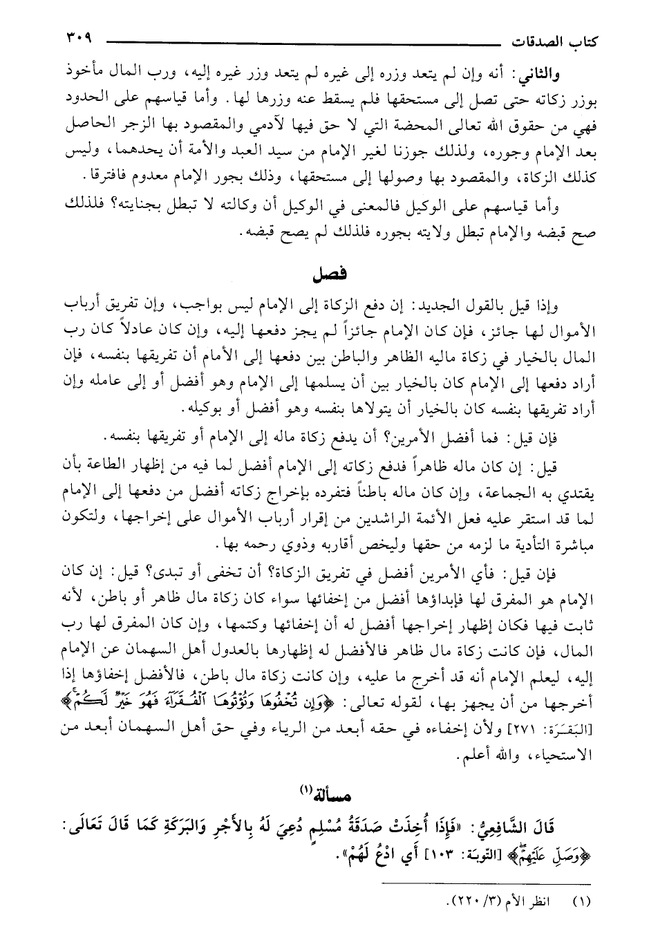 وإذا قيل بالقول الجديد: إن دفع الزكاة إلى الإمام ليس بواجب، وإن تفريق أرباب الأموال لها جائز، فإن كان الإمام جائزا لم يجز دفعها إليه، وإن كان عادلاً كان رب المال بالخيار في زكاة ماليه الظاهر والباطن بين دفعها إلى الأمام أن تفريقها بنفسه، فإن أراد دفعها إلى الإمام كان بالخيار بين أن يسلمها إلى الإمام وهو أفضل أو إلى عامله وإن أراد تفريقها بنفسه كان بالخيار أن يتولاها بنفسه وهو أفضل أو بوكيله.