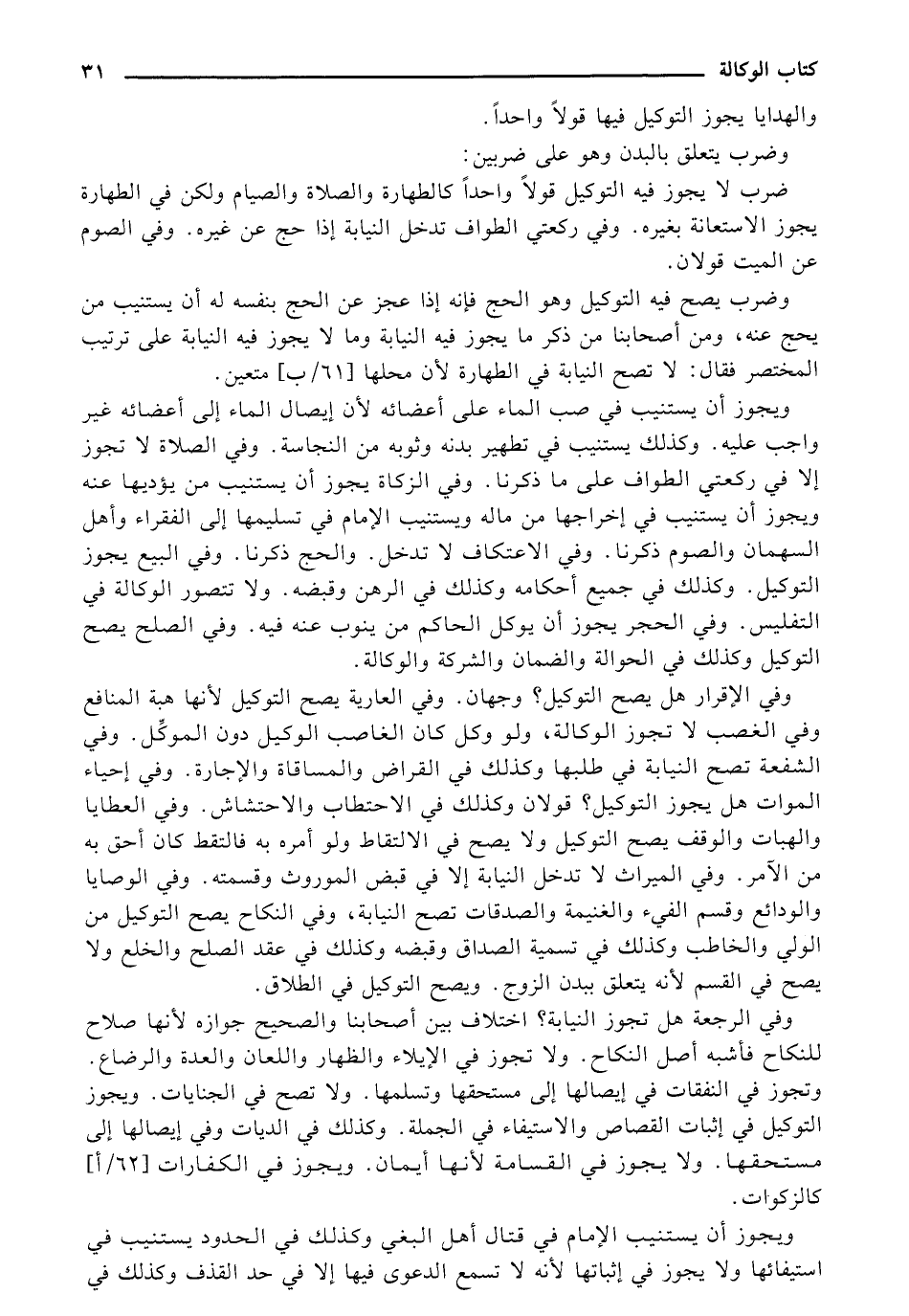 ويجوز أن يستنيب في صب الماء على أعضائه لأن إيصال الماء إلى أعضائه غير واجب عليه. وكذلك يستنيب في تطهير بدنه وثوبه من النجاسة. وفي الصلاة لا تجوز إلا في ركعتي الطواف على ما ذكرنا. وفي الزكاة يجوز أن يستنيب من يؤديها محنه ويجوز أن يستنيب في إخراجها من ماله ويستنيب الإمام في تسليمها إلى الفقراء وأهل السهمان والصوم ذكرنا. وفي الاعتكاف لا تدخل. والحج ذكرنا. وفي البيع يجوز التوكيل. وكذلك في جميع أحكامه وكذلك في الرهن وقبضه. ولا تتصور الوكالة في التفليس. وفي الحجر يجوز أن يوكل الحاكم من ينوب عنه فيه. وفي الصلح يصح التوكيل وكذلك في الحوالة والضمان والشركة والوكالة.