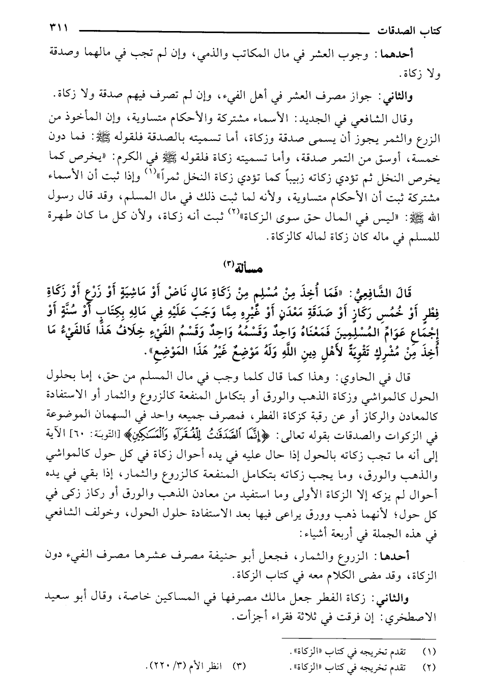 قال في الحاوي: وهذا كما قال كلما وجب في مال المسلم من حق، إما بحلول الحول كالمواشي وزكاة الذهب والورق أو بتكامل المنفعة كالزروع والثمار أو الاستفادة كالمعادن والركاز أو عن رقبة كزكاة الفطر، فمصرف جميعه واحد في السهمان الموضوعة في الزكوات والصدقات بقوله تعالى: {إِنَّمَا الصَّدَقَاتُ لِلْفُقَرَاءِ وَالْمَسَاكِينِ} [التوبة:60] الآية إلى أنه ما تجب زكاته بالحول إذا حال عليه في يده أحوال زكاة في كل حول كالمواشي والذهب والورق، وما يجب زكاته بتكامل المنفعة كالزروع والثمار، إذا بقي في يده أحوال لم يزكه إلا الزكاة الأولى وما استفيد من معادن الذهب والورق أو ركاز زكى في كل حول؛ لأنهما ذهبه وورق يراعى فيها بعد الاستفادة حلول الحول، وخولف الشافعي في هذه الجملة في أربعة أشياء: