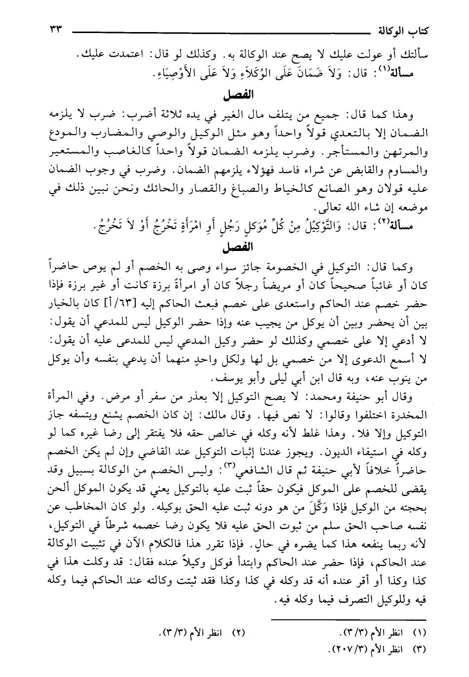 وقال أبو حنيفة ومحمد: لا يصح التوكيل إلا بعذر من سفر أو مرض. وفي المرأة المخدرة اختلفوا وقالوا: لا نص فيها. وقال مالك: إن كان الخصم يشنع ويتسفه جاز التوكيل وإلا فلا. وهذا غلط لأنه وكله في خالص حقه فلا يفتقر إلى رضا غيره كما لو وكله في استيفاء الديون. ويجوز عندنا إثبات التوكيل عند القافي وإن لم يكن الخصم حاضرًا خلافًا لأبي حنيفة ثم قال الشافعي (¬3): وليس الخصم من الوكالة بسبيل وقد يقضى للخصم على الموكل فيكون حقًا ثبت عليه بالتوكيل يعني قد يكون الموكل ألحن بحجته من الوكيل فإذا وكل من هو دونه ثبت عليه الحق بوكيله. ولو كان المخاطب عن نفسه صاحب الحق سلم من ثبوت الحق عليه فلا يكون رضا خصمه شرطًا في التوكيل، لأنه ربما ينفعه هذا كما يضره في حال. فإذا تقرر هذا فالكلام الآن في تثبيت الوكالة عند الحاكم، فإذا حضر عند الحاكم وابتدأ فوكل وكيلًا عنده فقال: قد وكلت هذا في كذا وكذا أو أقر عناه أنه قد وكله في كذا وكذا فقد ثبتت وكالته عند الحاكم فيما وكله فيه وللوكيل التصرف فيما وكله فيه.