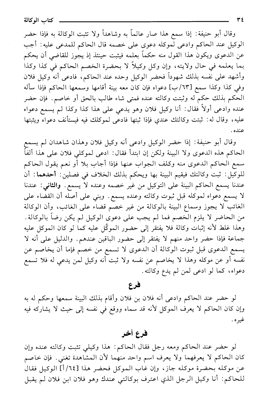 وقال أبو حنيفة: إذا سمع هذا صار عالماً به وشاهدًا ولا تثبت الوكالة به فإذا حضر الوكيل عند الحاكم وادعى لموكله دعوى على خصمه قال الحاكم للمدعى عليه: أجب عن الدعوى ويكون هذا القول منه حكمًا بعلمه فيبت حينئذ إذ يجوز للقاضي أن يحكم بما يعلمه في حال ولايته، وأن وكل وكيلًا لا بحضرة الخصم الحاكم في كذا وكذا وأشهد على نفسه بذلك شهودًا فحضر الوكيل وحده عند الحاكم، فادعى أنه وكيل فلان وفي كذا وكذا سمع [63/ ب] دعواه فإن كان معه بينة أقامها وسمعها الحاكم فإذا سأله الحكم بذلك حكم له وثبت وكالته عنده فمتى شاء طالب بالحق أو خاصم. فإذ حضر عنده وادعى أولًا فقال: أنا وكيل فلان وهو يدعي على هذا كذا وكذا لم يسمع دعواه عليه، وقال له: ثبتت وكالتك عندي فإذا ثبتها فادعى لموكلك فيه فيستأنف دعواه ويثبتها عنده.