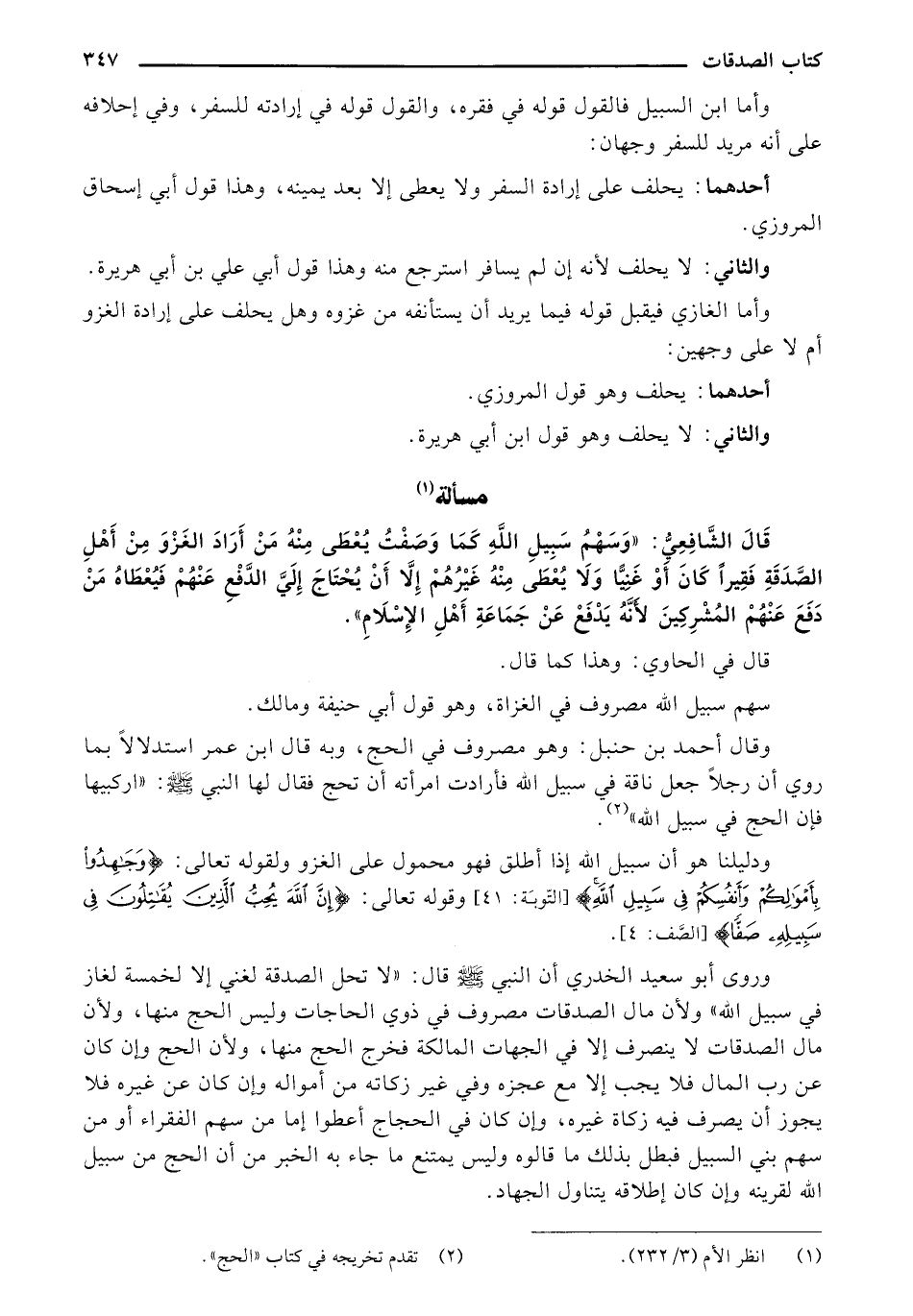 قال الشافعي: "وسهم سبيل الله كما وصفت يعطى منه من أراد الغزو من أهل الصدقة فقيراً كان أو غنياً ولا يعطى منه غيرهم إلا أن يحتاج إلي الدفع عنهم فيعطاه من دفع عنهم المشركين لأنه يدفع عن جماعة أهل الإسلام".