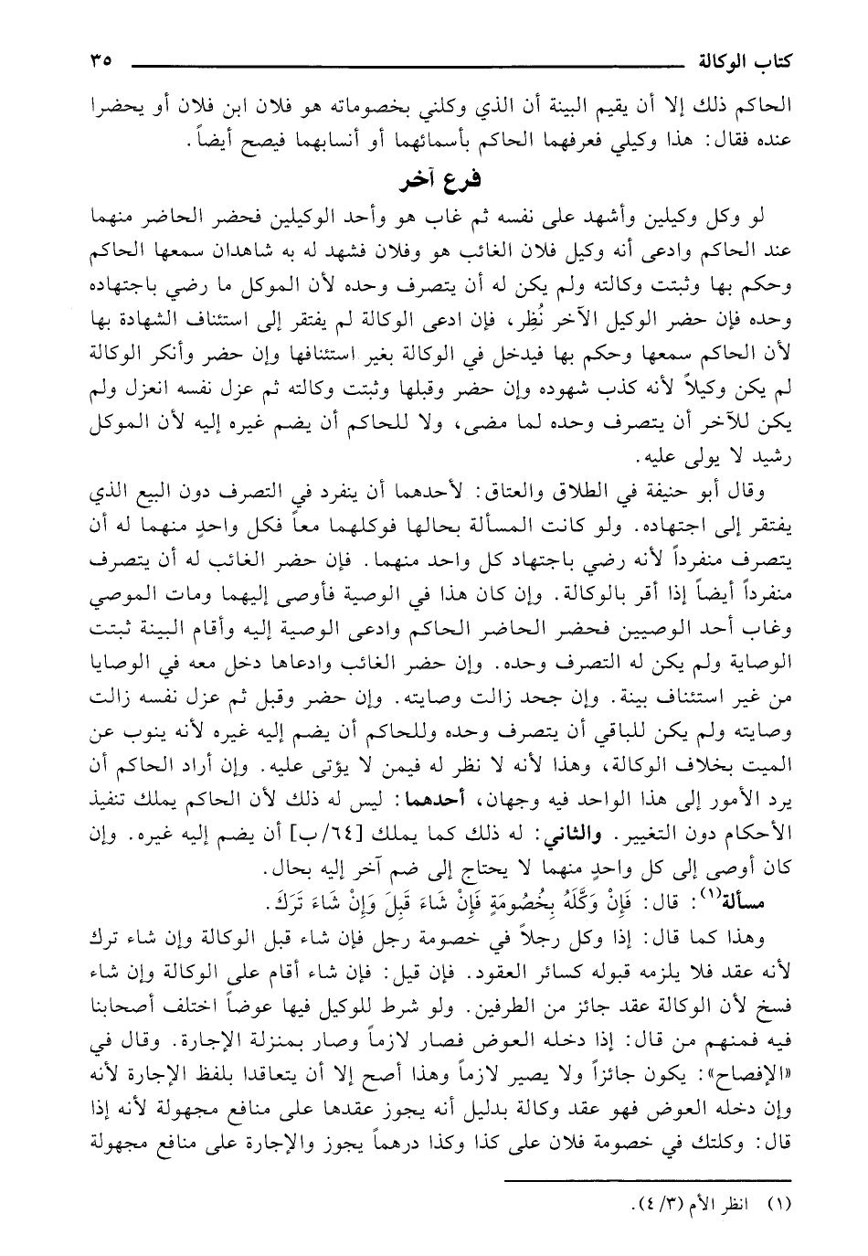 وقال أبو حنيفة في الطلاق والعتاق: لأحدهما أن ينفرد في التصرف دون البيع الذي يفتقر إلى اجتهاده. ولو كانت المسألة بحالها فوكلهما معًا فكل واحد منهما له أن يتصرف منفرداً لأنه رضي باجتهاد كل واحد منهما. فإن حضر الغائب له أن يتصرف منفردًا أيضا إذا أقر بالوكالة. وإن كان هذا في الوصية فأوصى إليهما ومات الموصي وغاب أحد الوصيين فحضر الحاضر الحاكم وادعى الوصية إليه وأقام البينة ثبتت الوصاية ولم يكن له التصرف وحده. وإن حضر الغائب وادعاها دخل معه في الوصايا من غير استئناف بينة. وإن جحد زالت وصايته. وإن حضر وقبل ثم عزل نفسه زالت وصايته ولم يكن للباقي أن يتصرف وحده وللحاكم أن يضم إليه غيره لأنه ينوب عن الميت بخلاف الوكالة، وهذا لأنه لا نظر له فيمن لا يؤتى عليه. وإن أراد الحاكم أن يرد الأمور إلى هذا الواحد فيه وجهان، أحدهما: ليس له ذلك لأن الحاكم يملك تنفيذ الأحكام دون التغيير. والثاني: له ذلك كما يملك [64/ ب] أن يضم إليه غيره. وإن كان أوصى إلى كل واحد منهما لا يحتاج إلى ضم أخر إليه بحال.
