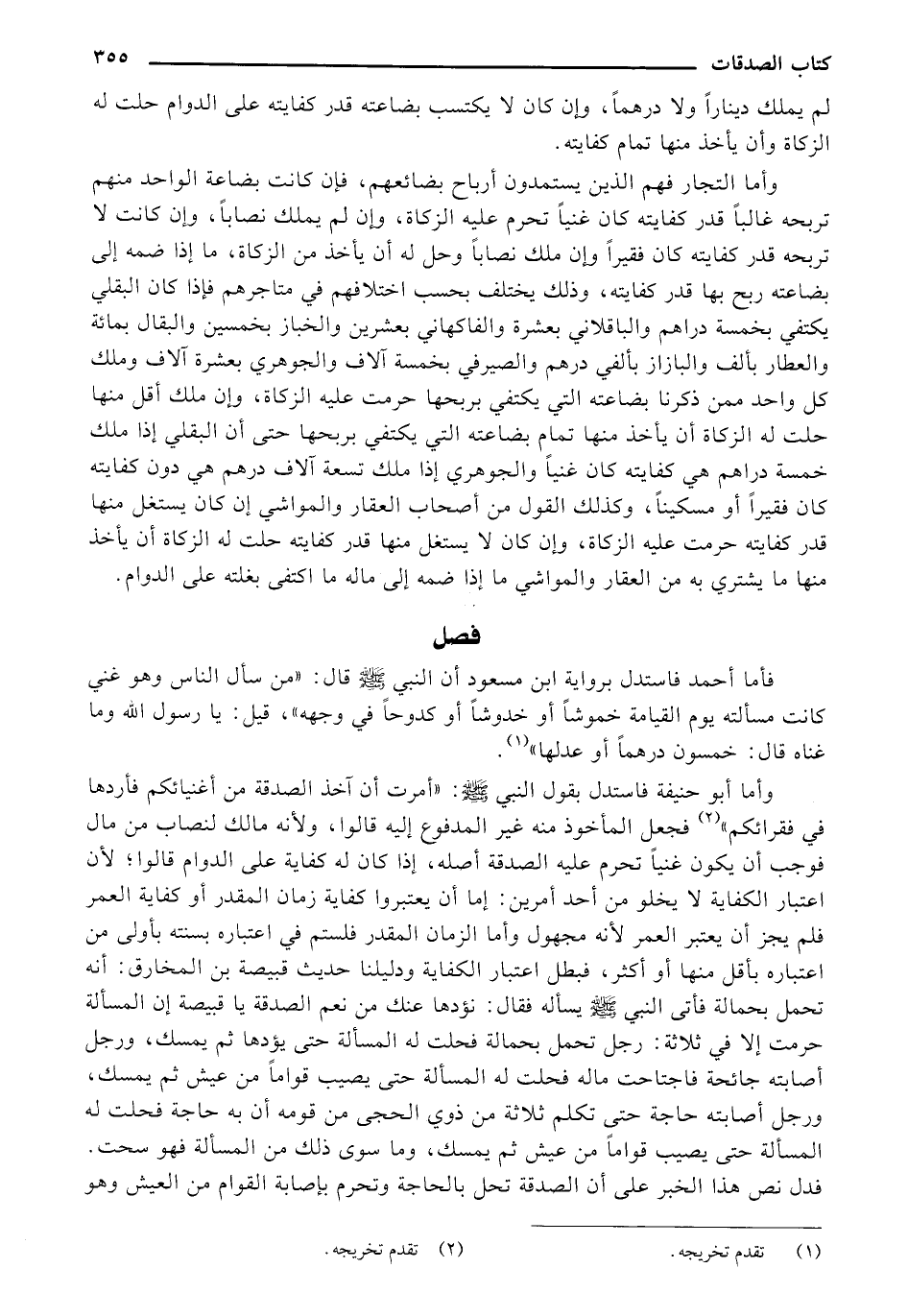 فأما أحمد فاستدل برواية ابن مسعود أن النبي - صلى الله عليه وسلم - قال: "من سأل الناس وهو غني كانت مسألته يوم القيامة خموشاً أو خدوشاً أو كدوحاً في وجهه"، قيل: يا رسول الله وما غناه قال: خمسون درهماً أو عدلها" (¬1).