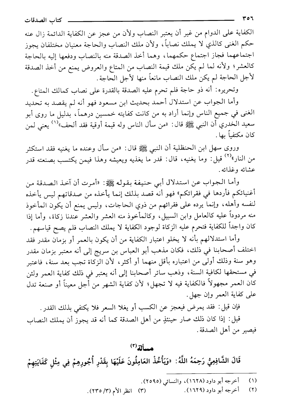 وأما الجواب عن استدلال أحمد بحديث ابن مسعود فهو أنه لم يقصد به تحديد الغنى في جميع الناس وإنما أراد به من كانت كفايته خمسين درهماً، بدليل ما روى أبو سعيد الخدري أن النبي - صلى الله عليه وسلم - قال: "من سأل الناس وله قيمة أوقية فقد ألحف" (¬1) يعني لمن كان مكتفياً بها.