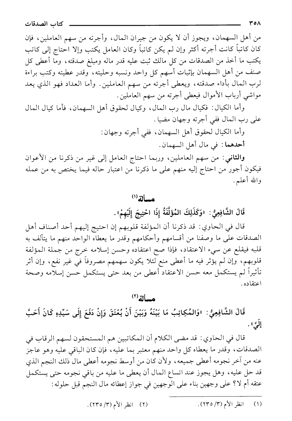 من أهل السهمان، ويجوز أن لا يكون من جيران المال، وأجرته من سهم العاملين، فإن كان كاتباً كانت أجرته أكثر وإن لم يكن كاتباً وكان العامل يكتب وإلا احتاج إلى كاتب يكتب ما أخذ من الصدقات من كل مالك ثبت عليه قدر ماله ومبلغ صدقته، وما أعطى كل صنف من أهل السهمان بإثبات أسهم كل واحد ونسبه وحليته، وقدر عطيته وكتب براءة لرب المال بأداء صدقته، ويعطى أجرته من سهم العاملين. وأما العداد فهو الذي يعد مواشي أرباب الأموال فيعطى أجرته من سهم العاملين.