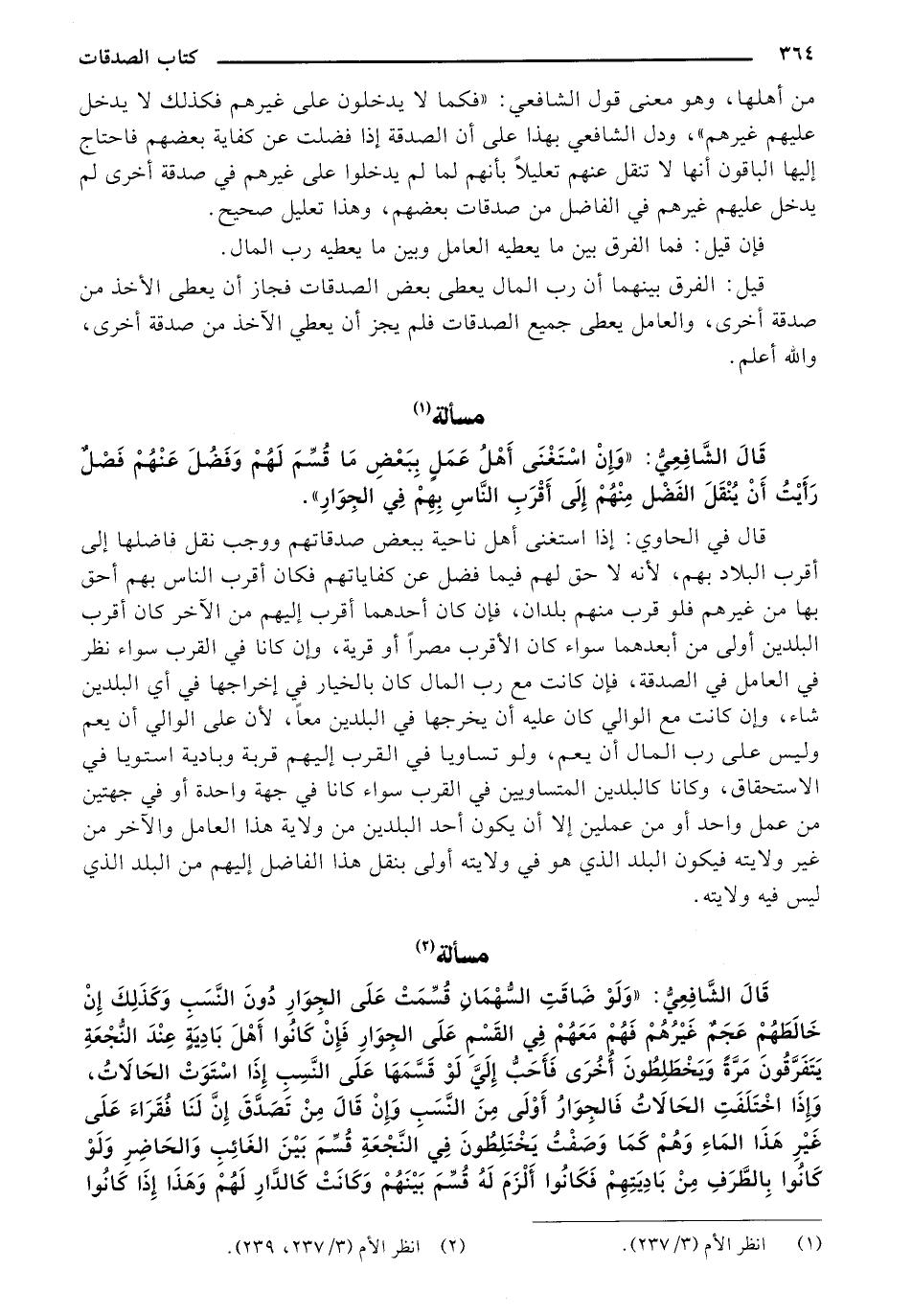 قال الشافعي: "ولو ضاقت السهمان قسمت على الجوار دون النسب وكذلك إن خالطهم عجم غيرهم فهم معهم في القسم على الجوار فإن كانوا أهل بادية عند النجعة يتفرقون مرة ويخطلطون أخرى فأحب إلي لو قسمها على النسب إذا استوت الحالات، وإذا اختلفت الحالات فالجوار أولى من النسب وإن قال من تصدق إن لنا فقراء على غير هذا الماء وهم كما وصفت يختلطون في النجعة قسم بين الغائب والحاضر ولو كانوا بالطرف من باديتهم فكانوا ألزم له قسم بينهم وكانت كالدار لهم وهذا إذا كانوا