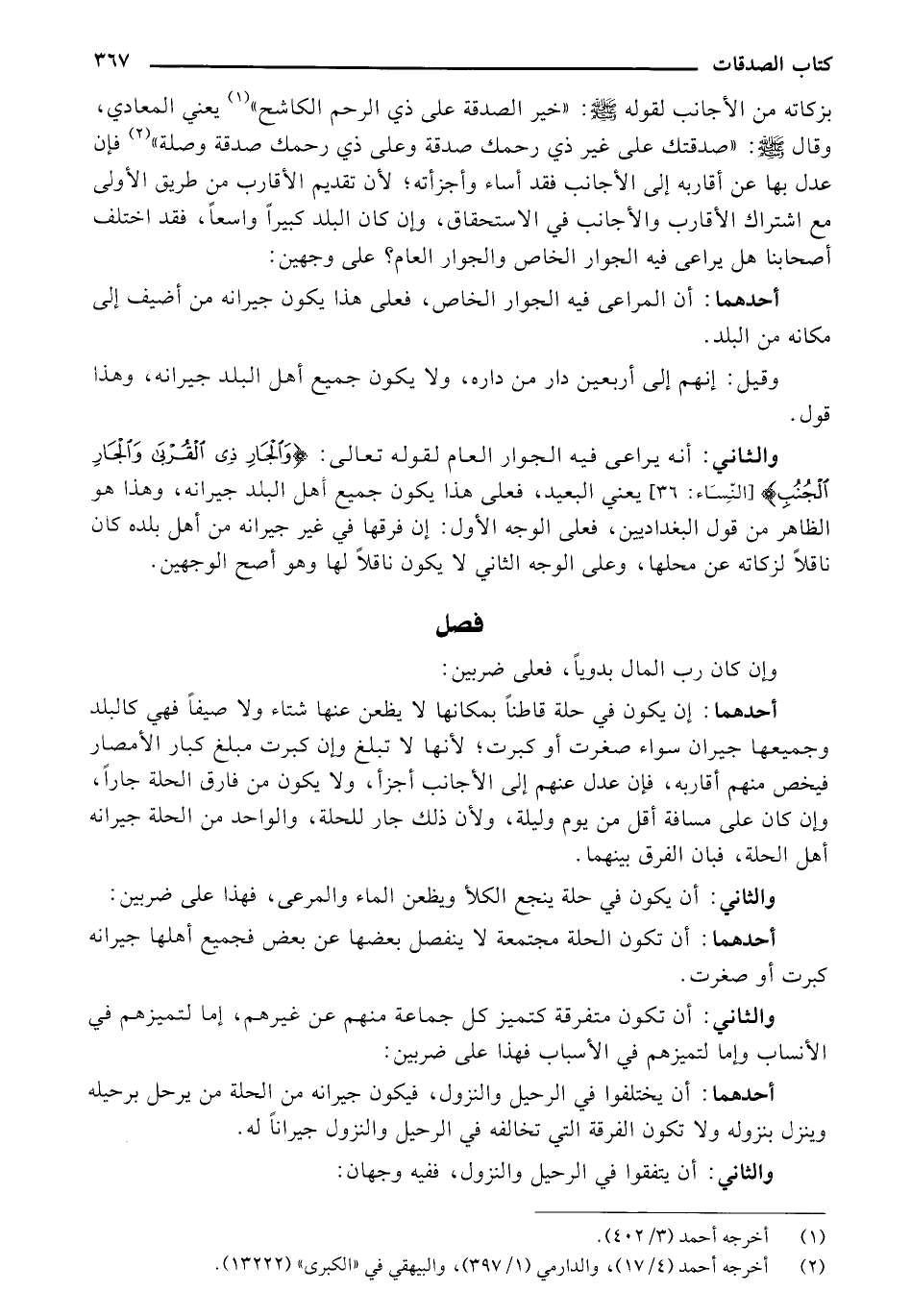 والثاني: أنه يراعى فيه الجوار العام لقوله تعالى: {وَالْجَارِ ذِي الْقُرْبَى وَالْجَارِ الْجُنُبِ} [النساء:36] يعني البعيد، فعلى هذا يكون جميع أهل البلد جيرانه، وهذا هو الظاهر من قول البغداديين، فعلى الوجه الأول: إن فرقها في غير جيرانه من أهل بلده لأن ناقلاً لزكاته عن محلها، وعلى الوجه الثاني لا يكون ناقلاً لها وهو أصح الوجهين.