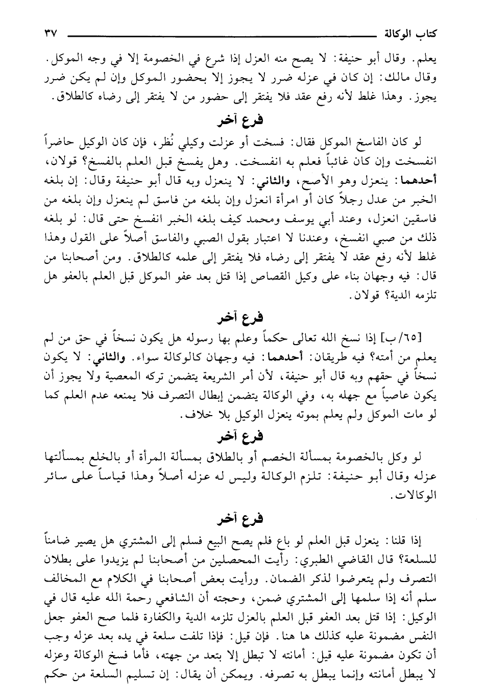 لو كان الفاسخ الموكل فقال: فسخت أو عزلت وكيلي نُظر، فإن كان الوكيل حاضرًا انفسخت وإن كان غائبًا فعلم به انفسخت. وهل يفسخ قبل العلم بالفسخ؟ قولان، أحدهما: ينعزل وهو الأصح، والثاني: لا ينعزل وبه قال أبو حنيفة وقال: إن بلغه الخبر من عدل رجلًا كان أو امرأة انعزل وإن بلغه من فاسق لم ينعزل وإن بلغه من فاسقين انعزل، وعن أبي يوسف ومحمد كيف بلغه الخبر انفسخ حتى قال: لو بلغه ذلك من صبي انفسخ، وعندنا لا اعتبار بقول الصبي والفاسق أصلًا على القول وهذا غلط لأنه رفع عقد لا يفتقر إلى رضاه فلا يفتقر إلى علمه كالطلاق. ومن أصحابنا من قال: فيه وجهان بناء على وكيل القصاص إذا قتل بعد عفو الموكل قبل العلم بالعفو هل تلزمه الدية؟ قولان.