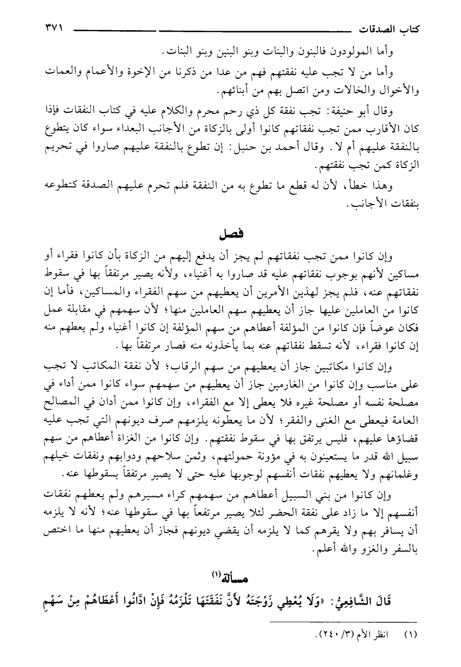 وقال أبو حنيفة: تجب نفقة كل ذي رحم محرم والكلام عليه في كتاب النفقات فإذا كان الأقارب ممن تجب نفقاتهم كانوا أولى بالزكاة من الأجانب البعداء سواء كان يتطوع بالنفقة عليهم أم لا. وقال أحمد بن حنبل: إن تطوع بالنفقة عليهم صاروا في تحريم الزكاة كمن تجب نفقتهم.
