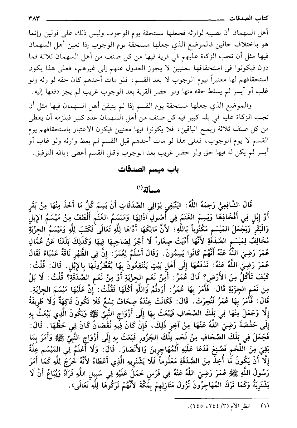 قال الشافعي رحمه الله: "ينبغي لوالي الصدقات أن يسم كل ما أخذ منها من بقر أو إبل في أفخاذها ويسم الغنم في أصول آذانها وميسم الغنم ألطف من ميسم الإبل والبقر ويجعل الميسم مكتوباً بالله؛ لأن مالكها أداها لله تعالى فكتب لله وميسم الجزية مخالف لميسم الصدقة لأنها أديت صغاراً لا أجر لصاحبها فيها وكذلك بلغنا عن عمال عمر رضي الله عنه أنهم كانوا يسمون. وقال أسلم لعمر: إن في الظهر ناقة عمياء فقال عمر رضي الله عنه: ندفعها إلى أهل بيت ينتفعون بها يقطرونها بالإبل. قال: قلت: كيف تأكل من الأرض؟ قال عمر: أمن نعم الجزية أو من نعم الصدقة؟ قلت: لا بل من نعم الجزية قال: فأمر بها عمر: أردتم والله لأكلها فقلت: إن عليها ميسم الجزية. قال: فأمر بها عمر فنحرت. قال: فكانت عنده صحاف تسع فلا تكون فاكهة ولا طريفة إلا وجعل منها في تلك الصحاف فيبعث بها إلى أزواج النبي - صلى الله عليه وسلم - ويكون الذي يبعث به إلى حفصة رضي الله عنها من آخر ذلك، فإن كان فيه نقصان كان في حظها. قال: فجعل في تلك الصحاف من لحم تلك الجزور فبعث به إلى أزواج النبي - صلى الله عليه وسلم - وأمر بما بقي من اللحم فصنع فدعا عليه المهاجرين والأنصار. قال: ولا أعلم في الميسم علة إلا أن يكون ما أخذ من الصدقة معلوماً فلا يشتريه الذي أعطاه لأنه خرج لله كما أمر رسول الله - صلى الله عليه وسلم - عمر رضي الله عنه في فرس حمل عليه في سبيل الله فرآه ويباع أن لا يشتريه وكما ترك المهاجرون نزول منازلهم بمكة لأنهم تركوها لله تعالى".