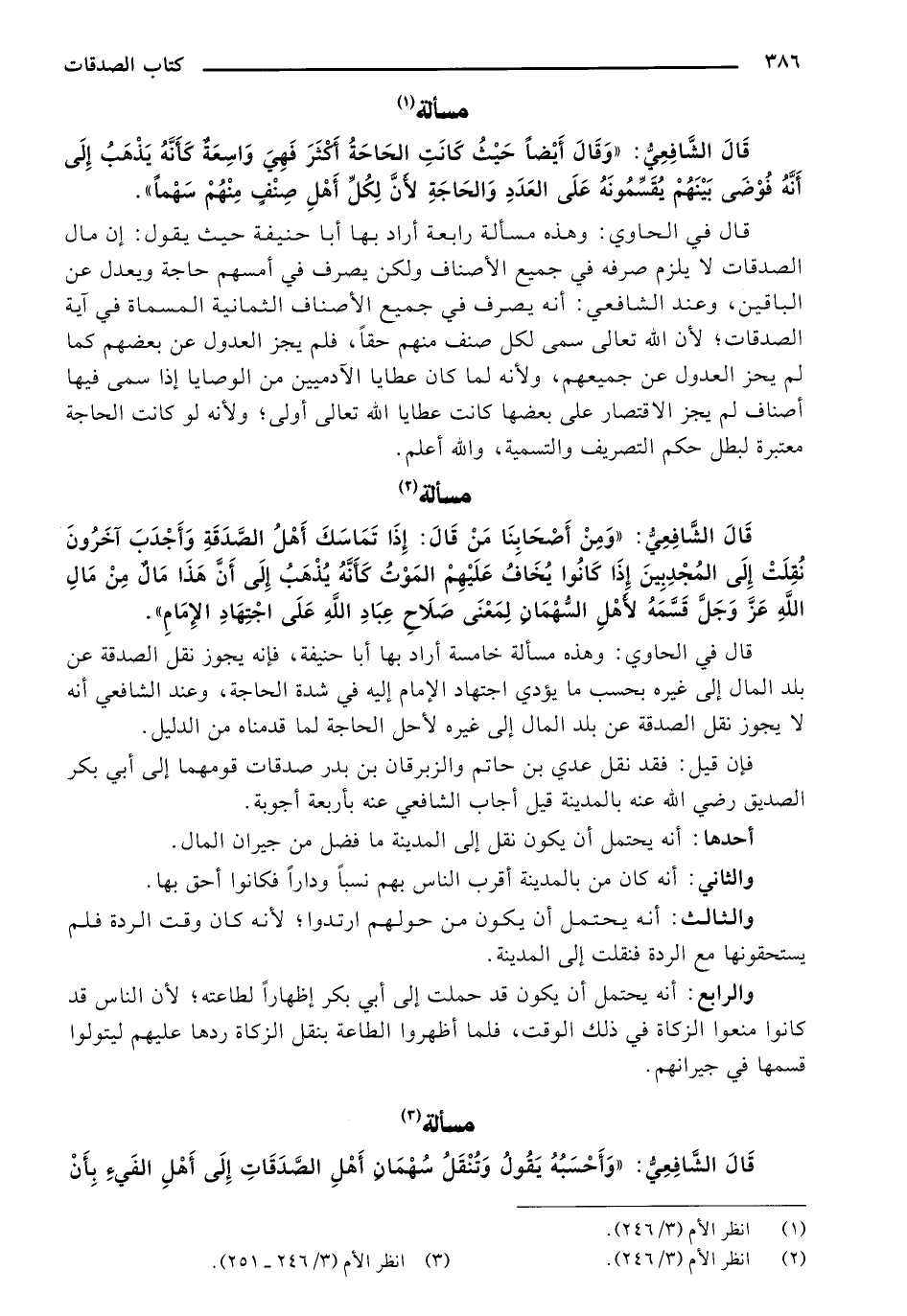 قال في الحاوي: وهذه مسألة رابعة أراد بها أبا حنيفة حيث يقول: إن مال الصدقات لا يلزم صرفه في جميع الأصناف ولكن يصرف في أمسهم حاجة ويعدل عن الباقين، وعند الشافعي: أنه يصرف في جميع الأصناف الثمانية المسماة في آية الصدقات؛ لأن الله تعالى سمى لكل صنف منهم حقاً، فلم يجز العدول عن بعضهم كما لم يجز العدول عن جميعهم، ولأنه لما كان عطايا الآدميين من الوصايا إذا سمى فيها أصناف لم يجز الاقتصار على بعضها كانت عطايا الله تعالى أولى؛ ولأنه لو كانت الحاجة معتبرة لبطل حكم التصريف والتسمية، والله أعلم.