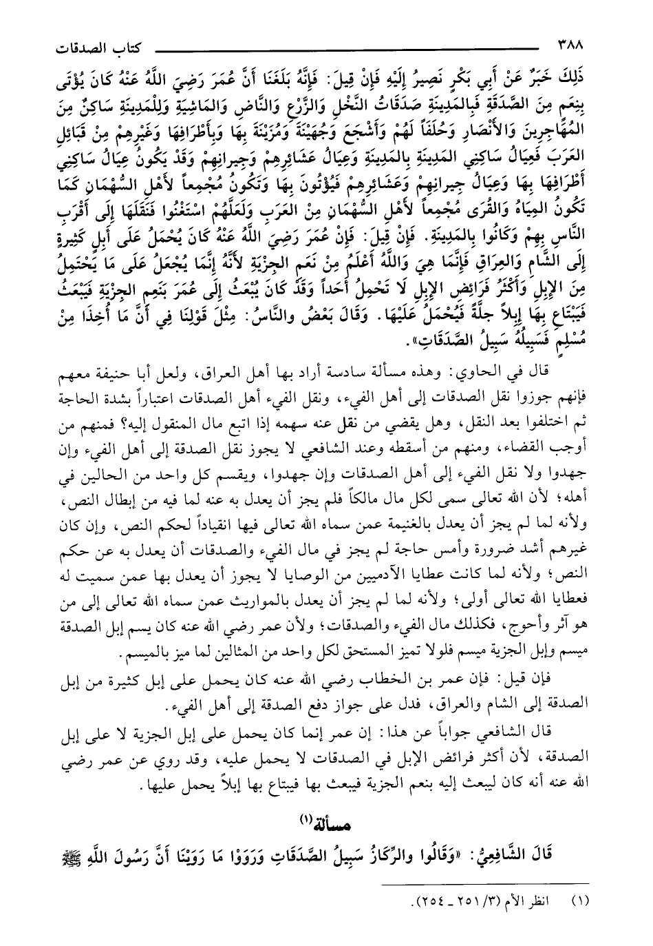 ذلك خبر عن أبي بكر نصير إليه فإن قيل: فإنه بلغنا أن عمر رضي الله عنه كان يؤتى بنعم من الصدقة فبالمدينة صدقات النخل والزرع والناض والماشية وللمدينة ساكن من المهاجرين والأنصار وحلفاً لهم وأشجع وجهينة ومزينة بها وبأطرافها وغيرهم من قبائل العرب فعيال ساكني المدينة بالمدينة وعيال عشائرهم وجيرانهم وقد يكون عيال ساكني أطرافها بها وعيال جيرانهم وعشائرهم فيؤتون بها وتكون مجمعاً لأهل السهمان كما تكون المياه والقرى مجمعاً لأهل السهمان من العرب ولعلهم استغنوا فنقلها إلى أقرب الناس بهم وكانوا بالمدينة. فإن قيل: فان عمر رضي الله عنه كان يحمل على أبل كثيرة إلى الشام والعراق فإنما هي والله أعلم من نعم الجزية لأنه إنما يجعل على ما يحتمل من الإبل وأكثر فرائض الإبل لا تحمل أحداً وقد كان يبعث إلى عمر بنعم الجزية فيبعث فيبتاع بها إبلاً جلة فيحمل عليها. وقال بعض والناس: مثل قولنا في أن ما أخذا من مسلم فسبيله سبيل الصدقات".