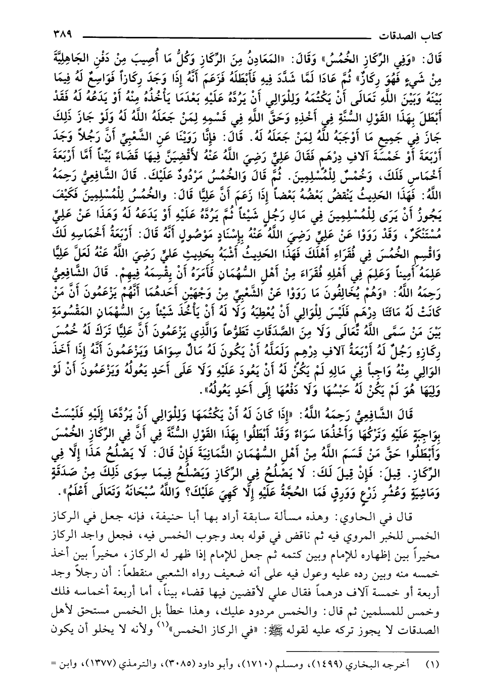 قال في الحاوي: وهذه مسألة سابقة أراد بها أبا حنيفة، فإنه جعل في الركاز الخمس للخبر المروي فيه ثم ناقض في قوله بعد وجوب الخمس فيه، فجعل واجد الركاز مخيراً بين إظهاره للإمام وبين كتمه ثم جعل للإمام إذا ظهر له الركاز، مخيراً بين أخذ خمسه منه وبين رده عليه وعول فيه على أنه ضعيف رواه الشعبي منقطعاً: أن رجلاً وجد أربعة أو خمسة آلاف درهماً فقال علي لأقضين فيها قضاء بيناً، أما أربعة أخماسه فلك وخمس للمسلمين ثم قال: والخمس مردود عليك، وهذا خطأ بل الخمس مستحق لأهل الصدقات لا يجوز تركه عليه لقوله - صلى الله عليه وسلم -: "في الركاز الخمس" (¬1) ولأنه لا يخلو أن يكون