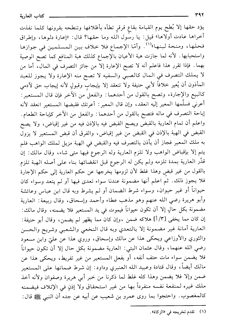 يؤد حقها إلا بطح يوم القيامة بقاع قرقر تطأه بأظلافها وتنطحه بقرونها كلما نفذت أخراها عادت أولاها" قيل: يا رسول الله وما حقها؟ قال: "إعارة دلوها، وإطراق فحلها، ومنحة لبنها" (¬1). وأما الإجماع فلا خلاف بين المسلمين في جوازها واستحبابها. لأنه لما جازت هبة الأعيان بالإجماع كذلك هبة المنافع كما تصح الوصية بهما. فإذا تقرر هذا فاعلم أنه لا تصح الإعارة إلا من جائز التصرف في المال، أما من لا يملك التصرف في المال كالصبي والسفيه لا تصح منه الإعارة ولا يجوز للعبد المأذون أن يعير خلافاً لأبي حنيفة ولا تنعقد إلا بإيجاب وقبول لأنه إيجاب حق لآدمي كالبيع والإجارة، وتصح بالقول من أحدهما: والفعل من الآخر فإن قال المستعير: أعرني فسلمها المعير إليه انعقد، وإن قال المعير: أعرتك فقبضها المستعير انعقد لأنه إباحة التصرف في ماله فتصح بالقول من أحدهما: والفعل من الآخر كإباحة الطعام. واعلم أن تمام العارية بالقبض ويصح القبض فيه بالإذن فيه من غير إقباض، ولا يصح القبض في الهبة بالإذن في القبض من غير إقباض، والفرق أن قبض المستعير لا يزول به ملك المعير فجاز أن يأذن بالتصرف فيه والقبض في الهبة مزيل لملك الواهب فلم يتم إلا بإقباض الواهب ولا تلزم العارية وله الرجوع فيها متى شاء، وقال مالك: إن قدر العارية بمدة تلزمه ولم يكن له الرجوع قبل انقضائها بناء على أصله الهبة تلزم بالقول من غير قبض وهذا غلط لأن لزومها يخرجها عن حكم العارية إلى حكم الإجارة فلا يجوز ذلك. ثم اعلم أنها مضمونة عندنا سواء تعدى فيها أو لم يتعد وسواء كان حيواناً أو غير حيوان، وسواء شرط الضمان أو لم يشرط وبه قال ابن عباس وعائشة وأبو هريرة رضي الله عنهم وهو مذهب عطاء وأحمد وإسحاق، وقال ربيعة: العارية مضمونة بكل حال إلا أن تكون حيواناً فيموت في يد المستعير فلا يضمنه، وقال مالك: إن كان مما يخفى [3/أ] هلاكه ضمن، وإن كان مما يظهر لم يضمن، وقال أبو حنيفة: العارية أمانة غير مضمونة إلا بالتعدي وبه قال النخعي والشعبي وشريح والحسن والثوري والأوزاعي ويحكى هذا عن مالك وإسحاق، وروي هذا عن علي وابن مسعود رضي الله عنهما، وقال عثمان البتي: العارية مضمونة بكل حال إلا أن تكون حيواناً فلا يضمن سواء مات حتف أنفه، أو بفعل المستعير من غير تفريط، ويحكى هذا عن مالك أيضاً، وقال قتادة وعبيد الله العنبري وداود: إن شرط ضمانها على المستعير ضمن وإلا فلا يضمن وهذا كله غلط لما ذكرنا من خبر أبي هريرة وصفوان ولأنه أخذ ملك غيره لمنفعة نفسه منفرداً بها من غير استحقاق ولا إذن في الإتلاف فيضمنه كالمغصوب. واحتجوا بما روى عمرو بن شعيب عن أبيه عن جده أن النبي - صلى الله عليه وسلم - قال: