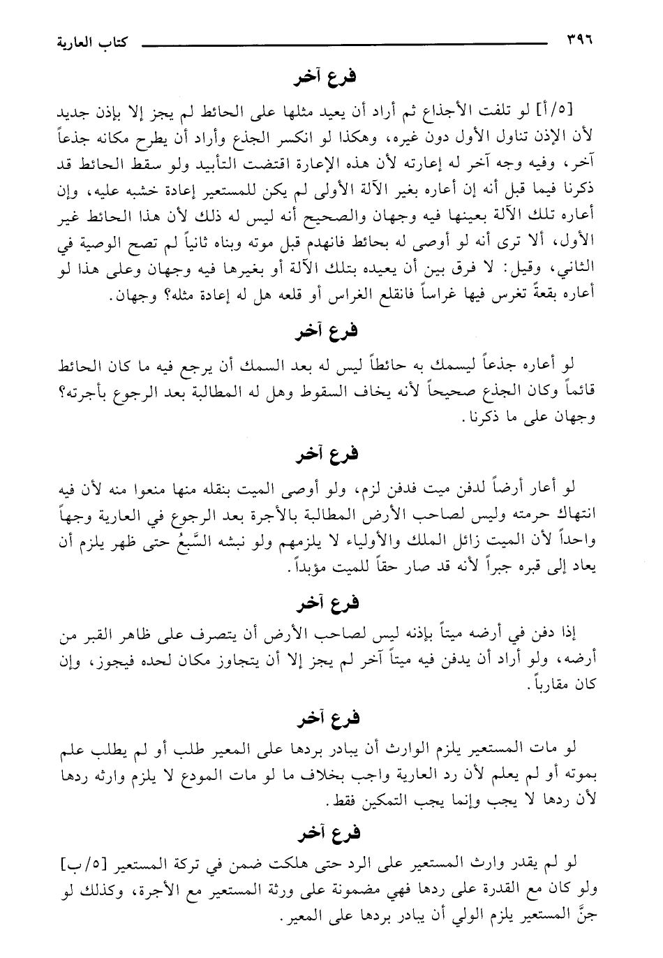 [5/أ] لو تلفت الأجذاع ثم أراد أن يعيد مثلها على الحائط لم يجز إلا بإذن جديد لأن الإذن تناول الأول دون غيره، وهكذا لو انكسر الجذع وأراد أن يطرح مكانه جذعاً آخر، وفيه وجه آخر له إعارته لأن هذه الإعارة اقتضت التأبيد ولو سقط الحائط قد ذكرنا فيما قبل أنه إن أعاره بغير الآلة الأولى لم يكن للمستعير إعادة خشبه عليه، وإن أعاره تلك الآلة بعينها فيه وجهان والصحيح أنه ليس له ذلك لأن هذا الحائط غير الأول، ألا ترى أنه لو أوصى له بحائط فانهدم قبل موته وبناه ثانياً لم تصح الوصية في الثاني، وقيل: لا فرق بين أن يعداه بتلك الآلة أو بغيرها فيه وجهان وعلى هذا لو أعاره بقعة تغرس فيها غراساً فانقلع الغراس أو قلعه هل له إعادة مثله؟ وجهان.