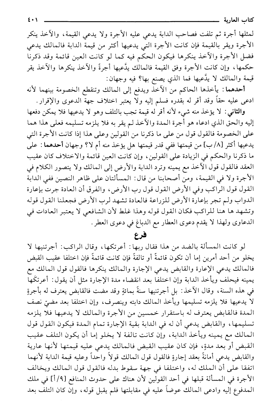 والثاني: لا يؤخذ منه شيء لأنه أقر له قيمة تجب بالتلف وهو لا يدعيها فلا يمكن دفعها إليه والحق الذي ادعاه هو أجرة المدة والآخذ لم يقر به فلا يلزمه تسليمه فعلى هذا هما على الخصومة فالقول قول من على ما ذكرنا من القولين وعلى هذا إذا كانت الأجرة التي يدعيها أكثر [8 / ب] من قيمتها ففي قدر قيمتها هل يؤخذ منه أم لا؟ وجهان أحدهما: ما ذكرنا والحكم في الزيادة على القولين، وإن كانت العين قائمة والاختلاف كان عقيب العقد فالقول قول الآخذ مع يمينه وترد الدابة والأرض إلى المالك ولا يتصور الكلام في الأجرة ولا في القيمة، ومن أصحابنا من قال: المسألتان على ظاهر النصين ففي الدابة القول قول الراكب وفي الأرض القول قول رب الأرض، والفرق أن العادة جرت بإعارة الدواب ولم تجر بإعارة الأرض للزراعة فالعادة تشهد لرب الأرض فجعلنا القول قوله وتشهد ها هنا للراكب فكان القول قوله وهذا غلط لأن الشافعي لا يعتبر العادات في الدعاوى ولهذا لا يقدم دعوى العطار مع الدباغ في دعوى العطر.