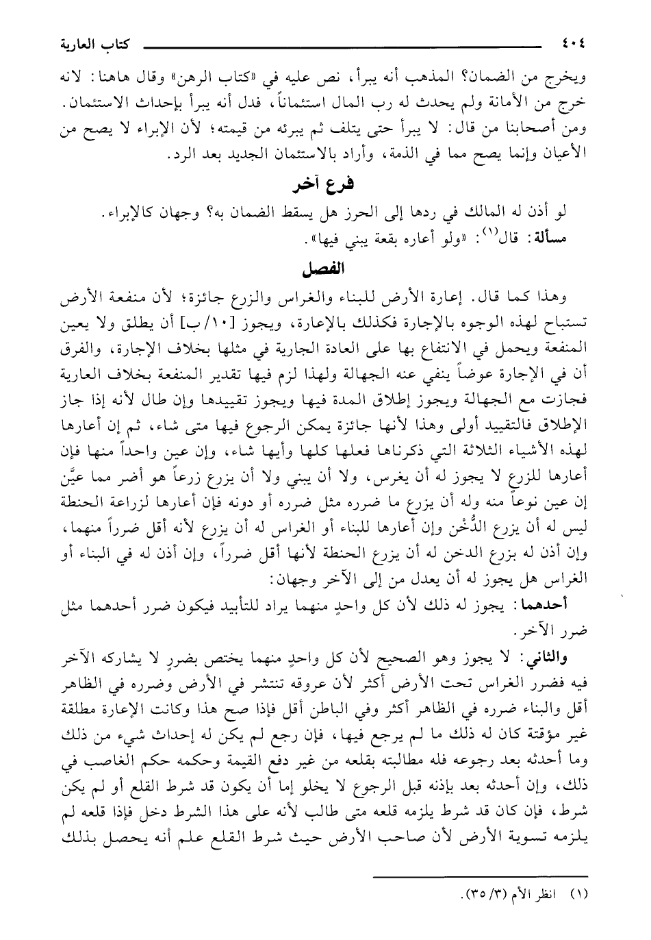 وهذا كما قال. إعارة الأرض للبناء والغراس والزرع جائزة: لأن منفعة الأرض تستباح لهذه الوجوه بالإجارة فكذلك بالإعارة، ويجوز [10/ب] أن يطلق ولا يعين المنفعة ويحمل في الانتفاع بها على العادة الجارية في مثلها بخلاف الإجارة، والفرق أن في الإجارة عوضاً ينفي عنه الجهالة ولهذا لزم فيها تقدير المنفعة بخلاف العارية فجازت مع الجهالة ويجوز إطلاق المدة فيها ويجوز تقييدها وإن طال لأنه إذا جاز الإطلاق فالتقييد أولى وهذا لأنها جائزة يمكن الرجوع فيها متى شاء، ثم إن أعارها لهذه الأشياء الثلاثة التي ذكرناها فعلها كلها وأيها شاء، وإن عين واحداً منها فإن أعارها للزرع لا يجوز له أن يغرس، ولا أن يبني ولا أن يزرع زرعاً هو أضر مما عينَّ إن عين نوعا منه وله أن يزرع ما ضرره مثل ضرره أو دونه فإن أعارها لزراعة الحنطة ليس له أن يزرع الدُّخْن وان أعارها للبناء أو الغراس له أن يزرع لأنه أقل ضرراً منهما، وإن أذن له بزرع الدخن له أن يزرع الحنطة لأنها أقل ضرراً، وإن أذن له في البناء أو الغراس هل يجوز له أن يعدل من إلى الآخر وجهان: