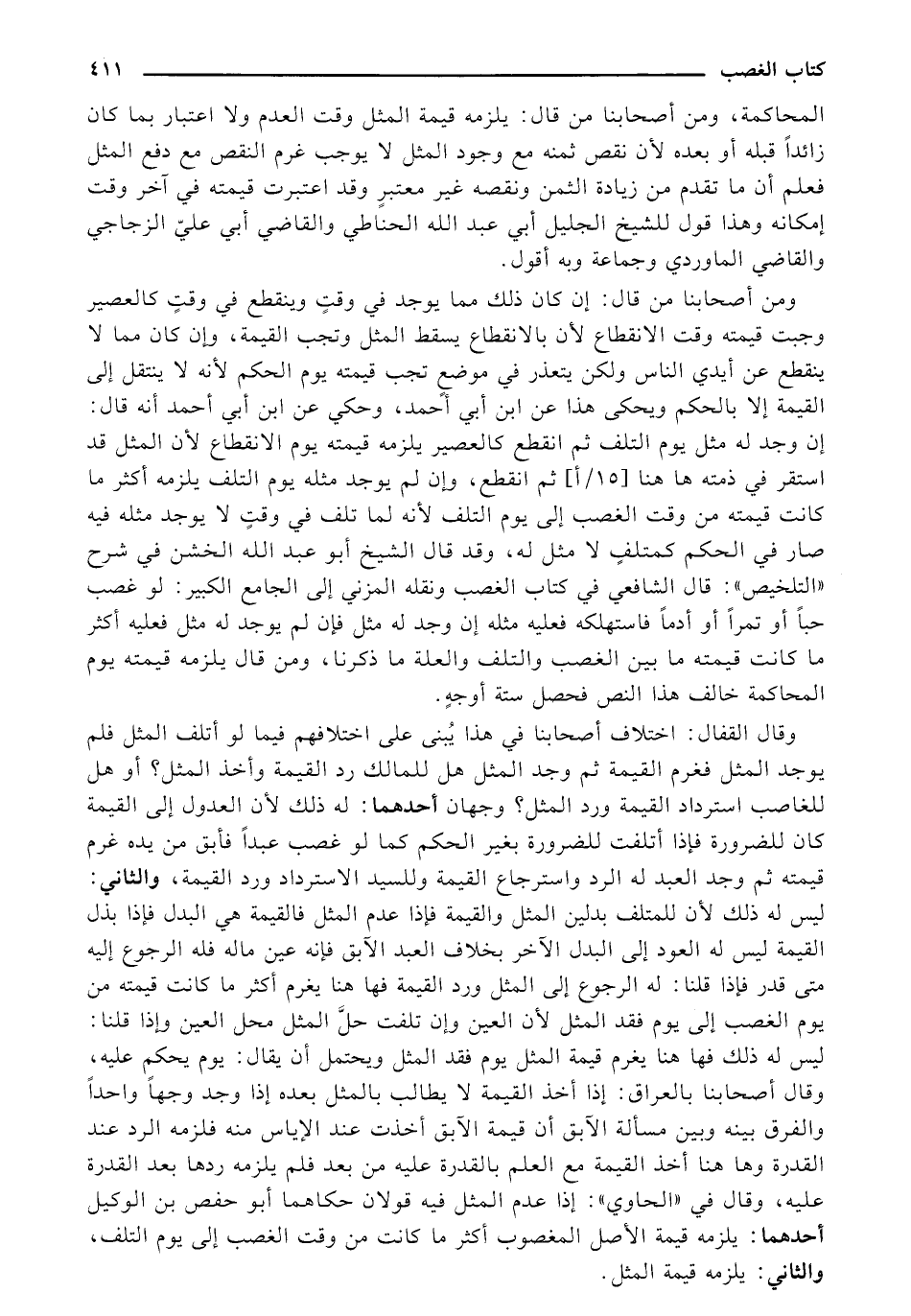 المحاكمة، ومن أصحابنا من قال: يلزمه قيمة المثل وقت العدم ولا اعتبار بما كان زائداً قبله أو بعده لأن نقص ثمنه مع وجود المثل لا يوجب غرم النقص مع دفع المثل فعلم أن ما تقدم من زيادة الثمن ونقصه غير معتبر وقد اعتبرت قيمته في آخر وقت إمكانه وهذا قول للشيخ الجليل أبي عبد الله الحناطي والقاضي أبي عليّ الزجاجي والقاضي الماوردي وجماعة وبه أقول.