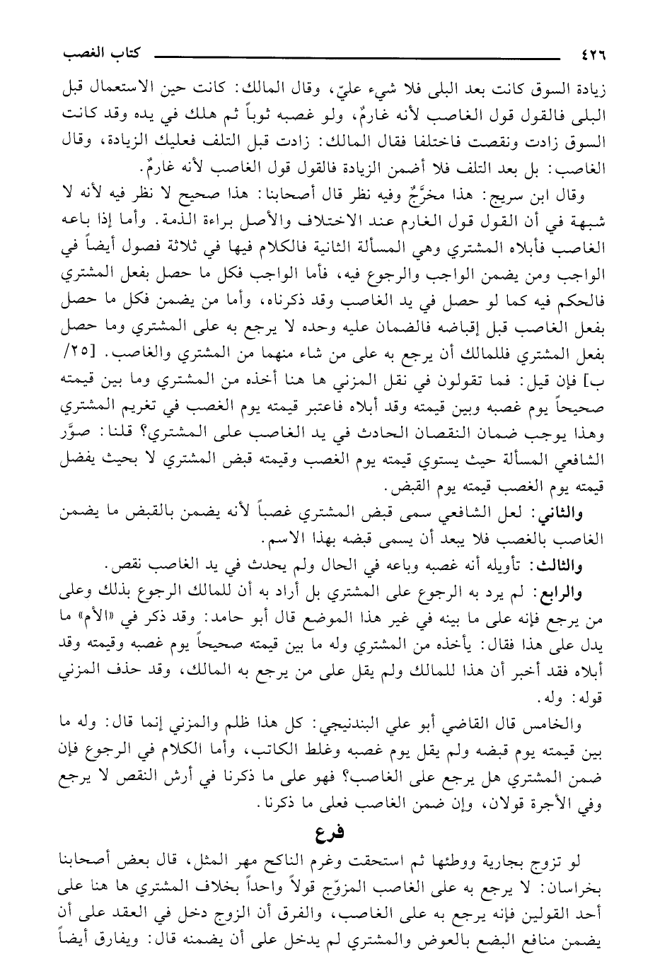 وقال ابن سريج: هذا مخرَّجٌ وفيه نظر قال أصحابنا: هذا صحيح لا نظر فيه لأنه لا شبهة في أن القول قول الغارم عند الاختلاف والأصل براءة الذمة. وأما إذا باعه الغاصب فأبلاه المشتري وهي المسألة الثانية فالكلام فيها في ثلاثة فصول أيضاً في الواجب ومن يضمن الواجب والرجوع فيه، فأما الواجب فكل ما حصل بفعل المشتري فالحكم فيه كما لو حصل في يد الغاصب وقد ذكرناه، وأما من يضمن فكل ما حصل بفعل الغاصب قبل إقباضه فالضمان عليه وحده لا يرجع به على المشتري وما حصل بفعل المشتري فللمالك أن يرجع به على من شاء منهما من المشتري والغاصب. [25/ب] فإن قيل: فما تقولون في نقل المزني ها هنا أخذه من المشتري وما بين قيمته صحيحاً يوم غصبه وبين قيمته وقد أبلاه فاعتبر قيمته يوم الغصب في تغريم المشتري وهذا يوجب ضمان النقصان الحادث في يد الغاصب على المشتري؟ قلنا: صوَّر الشافعي المسألة حيث يستوي قيمته يوم الغصب وقيمته قبض المشتري لا بحيث يفضل قيمته يوم الغصب قيمته يوم القبض.