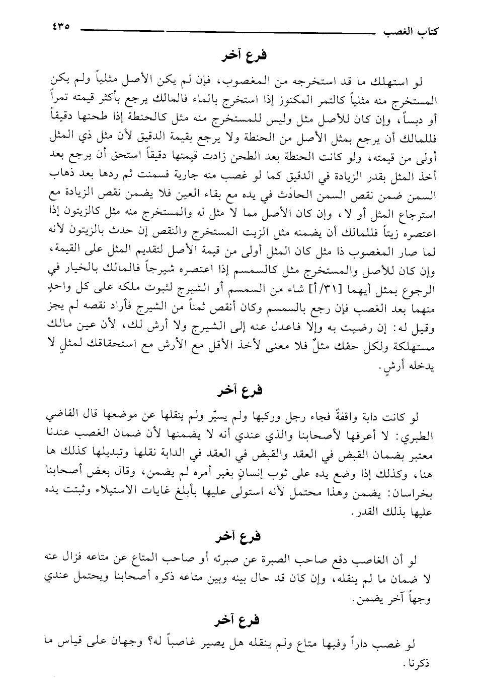 لو استهلك ما قد استخرجه من المغصوب، فإن لم يكن الأصل مثلياً ولم يكن المستخرج منه مثلياً كالتمر المكنوز إذا استخرج بالماء فالمالك يرجع بأكثر قيمته تمراً أو دبساً، وإن كان للأصل مثل وليس للمستخرج منه مثل كالحنطة إذا طحنها دقيقاً فللمالك أن يرجع بمثل الأصل من الحنطة ولا يرجع بقيمة الدقيق لأن مثل ذي المثل أولى من قيمته، ولو كانت الحنطة بعد الطحن زادت قيمتها دقيقاً استحق أن يرجع بعد أخذ المثل بقدر الزيادة في الدقيق كما لو غصب منه جارية فسمنت ثم ردها بعد ذهاب السمن ضمن نقص السمن الحادث في يده مع بقاء العين فلا يضمن نقص الزيادة مع استرجاع المثل أو لا، وإن كان الأمل مما لا مثل له والمستخرج منه مثل كالزيتون إذا اعتصره زيتأ فللمالك أن يضمنه مثل الزيت المستخرج والنقص إن حدث بالزيتون لأنه لما صار المغصوب ذا مثل كان المثل أولى من قيمة الأصل لتقديم المثل على القيمة، وإن كان للأصل والمستخرج مثل كالسمسم إذا اعتصره شيرجاً فالمالك بالخيار في الرجوع بمثل أيهما [31/أ] شاء من السمسم أو الشيرج لثبوت ملكه على كل واحدٍ منهما بعد الغصب فإن رجع بالسمسم وكان أنقص ثمناً من الشيرج فأراد نقصه لم يجز وقيل له: إن رضيت به وإلا فاعدل عنه إلى الشيرج ولا أرش لك، لأن عين مالك مستهلكة ولكل حقك مثلٌ فلا معنى لأخذ الأقل مع الأرش مع استحقاقك لمثل لا يدخله أرش.