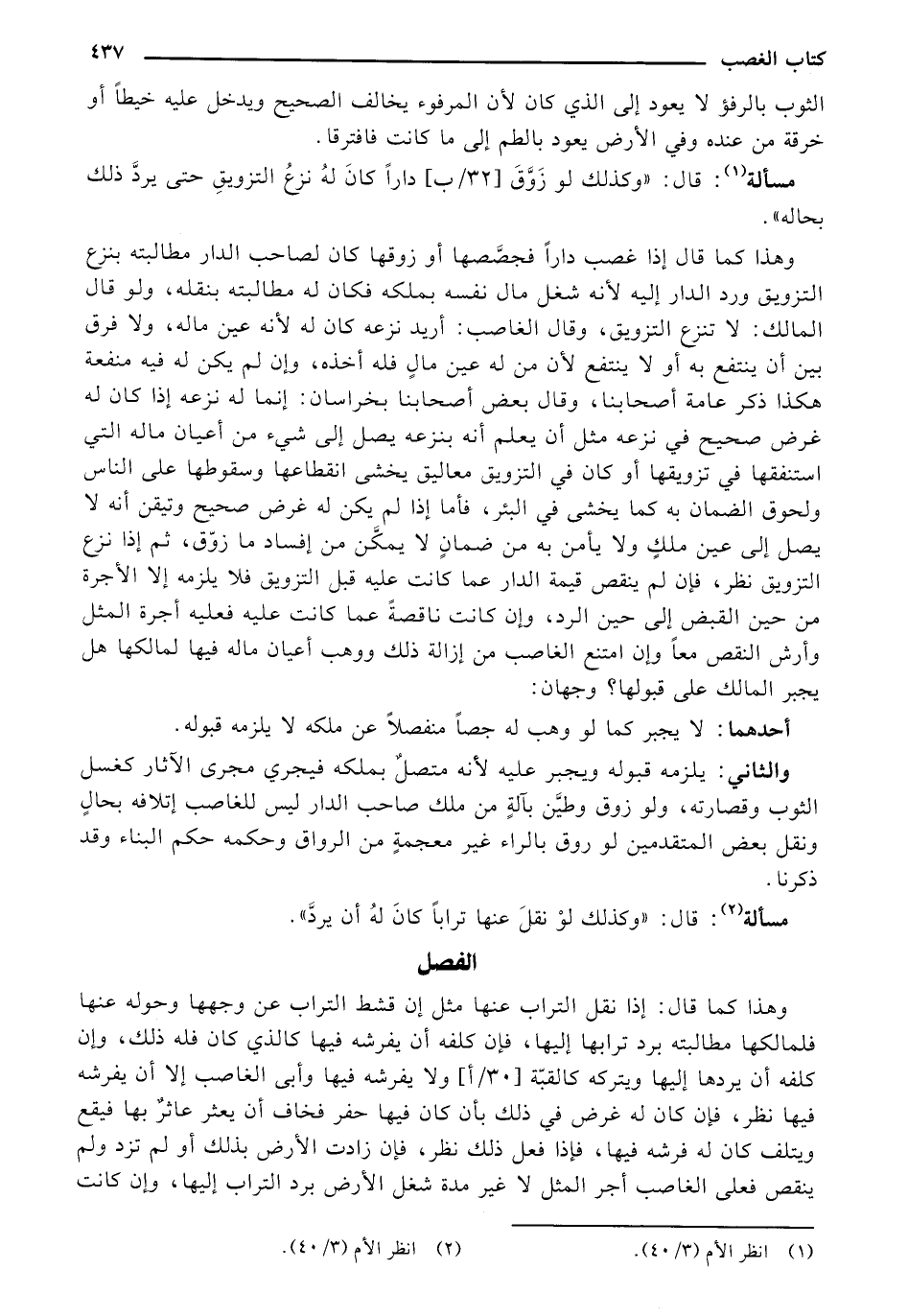 وهذا كما قال: إذا نقل التراب عنها مثل إن قشط التراب عن وجهها وحوله عنها فلمالكها مطالبته برد ترابها إليها، فإن كلفه أن يفرشه فيها كالذي كان فله ذلك، وإن كلفه أن يردها إليها ويتركه كالقبة [30/أ] ولا يفرشه فيها وأبى الغاصب إلا أن يفرشه فيها نظر، فإن كان له غرض في ذلك بأن كان فيها حفر فخاف أن يعثر عاثرٌ بها فيقع ويتلف كان له فرشه فيها، فإذا فعل ذلك نظر، فإن زادت الأرض بذلك أو لم تزد ولم ينقص فعلى الغاصب أجر المثل لا غير مدة شغل الأرض برد التراب إليها، وإن كانت