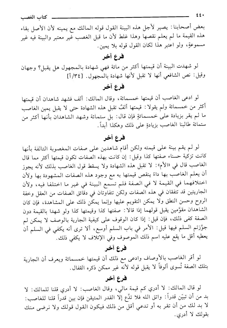 لو ادعى الغاصب أن قيمتها خمسمائة، وقال المالك: ألف فشهد شاهدان أن قيمتها أكثر من خمسمائة ولم يقولا: قيمتها ألفٌ تقبل هذه الشهادة حتى لا يقبل يمين الغاصب ما لم يقر بزيادة على خمسمائة فإن قال: بل ستمائة وشهد الشاهدان بأنها أكثر من ستمائة طالبنا الغاصب بزيادةٍ على ذلك وهكذا أبداً.