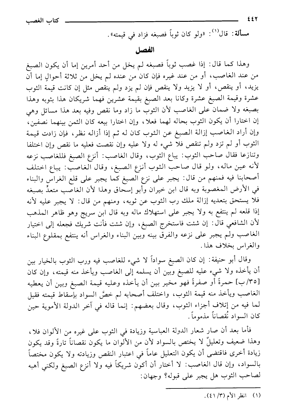 وقال أبو حنيفة: إن كان الصبغ سواداً لا شيء للغاصب فيه ورب الثوب بالخيار بين أن يأخذه ولا شيء عليه للصبغ وبين أن يسلمه إلى الغاصب ويأخذ منه قيمته، وإن كان [35/ب] حمرةً أو صفرةً فهو مخير بين أن يأخذه وعليه قيمة الصبغ وبين أن يعطيه الغاصب ويأخذ منه قيمة الثوب، واختلف أصحابه لم خصَّ السواد بإسقاط قيمته فقيل لما فيه من إتلاف أجزاء الثوب، وقال بعضهم: إنما قاله في آخر الدولة الأموية حين كان السواد نقصاناً مذموماً.
