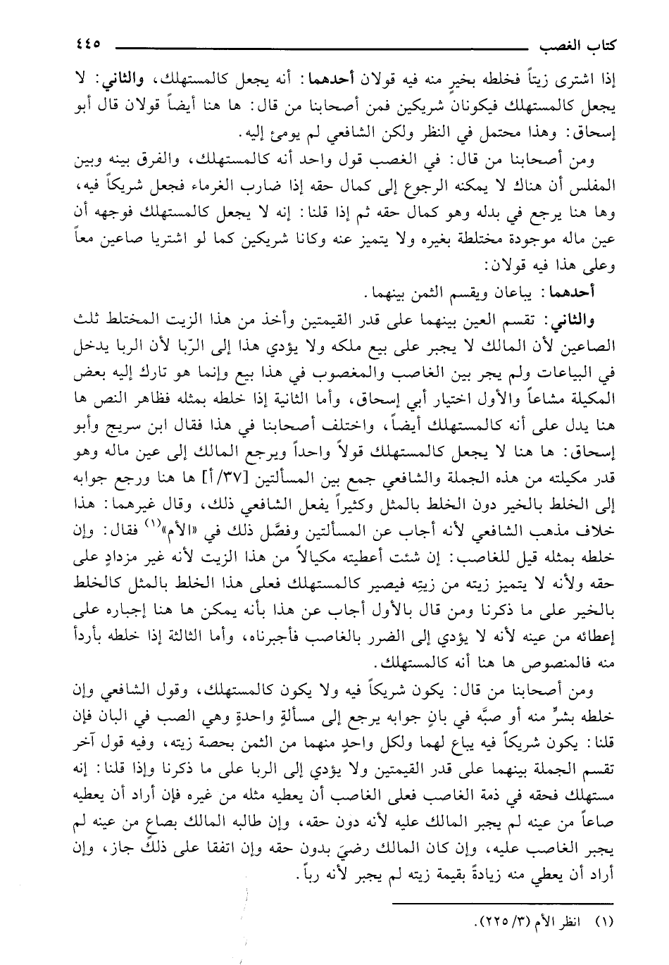 والثاني: تقسم العين بينهما على قدر القيمتين وأخذ من هذا الزيت المختلط ثلث الصاعين لأن المالك لا يجبر على بيع ملكه ولا يؤدي هذا إلى الرّبا لأن الربا يدخل في البياعات ولم يجبر بين الغاصب والمغصوب في هذا بيع وإنما هو تارك إليه بعض المكيلة مشاعاً والأول اختيار أبي إسحاق، وأما الثانية إذا خلطه بمثله فظاهر النص ها هنا يدل على أنه كالمستهلك أيضاً، واختلف أصحابنا في هذا فقال ابن سريج وأبو إسحاق: ها هنا لا يجعل كالمستهلك قولاً واحداً ويرجع المالك إلى عين ماله وهو قدر مكيلته من هذه الجملة والشافعي جمع بين المسألتين [37 /أ] ها هنا ورجع جوابه إلى الخلط بالخير دون الخلط بالمثل وكثيراً يفعل الشافعي ذلك، وقال غيرهما: هذا خلاف مذهب الشافعي لأنه أجاب عن المسألتين وفصَّل ذلك في "الأم" (¬1) فقال: وإن خلطه بمثله قيل للغاصب: إن شئت أعطيته مكيالاً من هذا الزيت لأنه غير مزدادٍ على حقه ولأنه لا يتميز زيته من زيتِه فيصير كالمستهلك فعلى هذا الخلط بالمثل كالخلط بالخير على ما ذكرنا ومن قال بالأول أجاب عن هذا بأنه يمكن ها هنا إجباره على إعطائه من عينه لأنه لا يؤدي إلى الضرر بالغاصب فأجبرناه، وأما الثالثة إذا خلطه بأردأ منه فالمنصوص ها هنا أنه كالمستهلك.